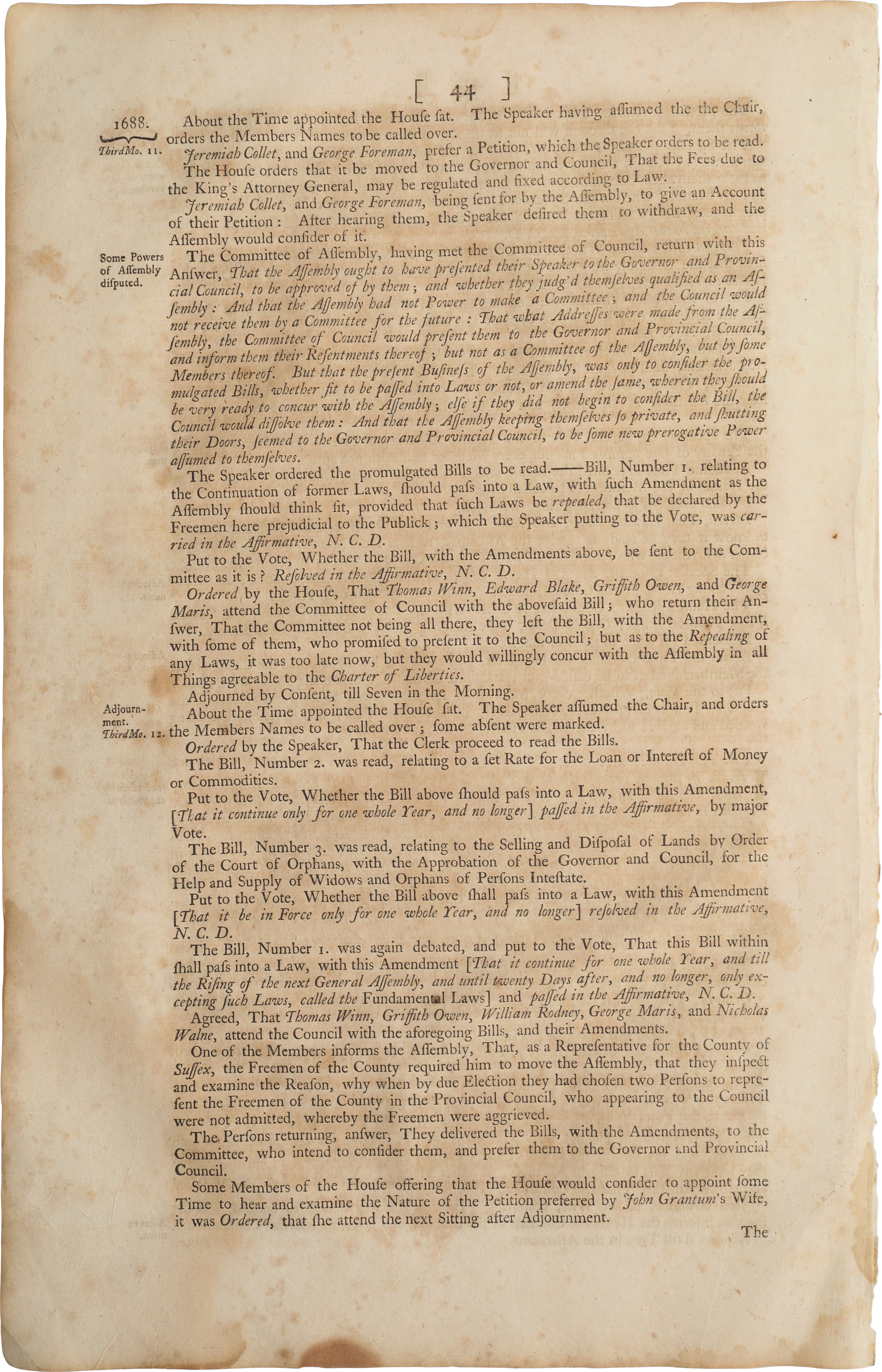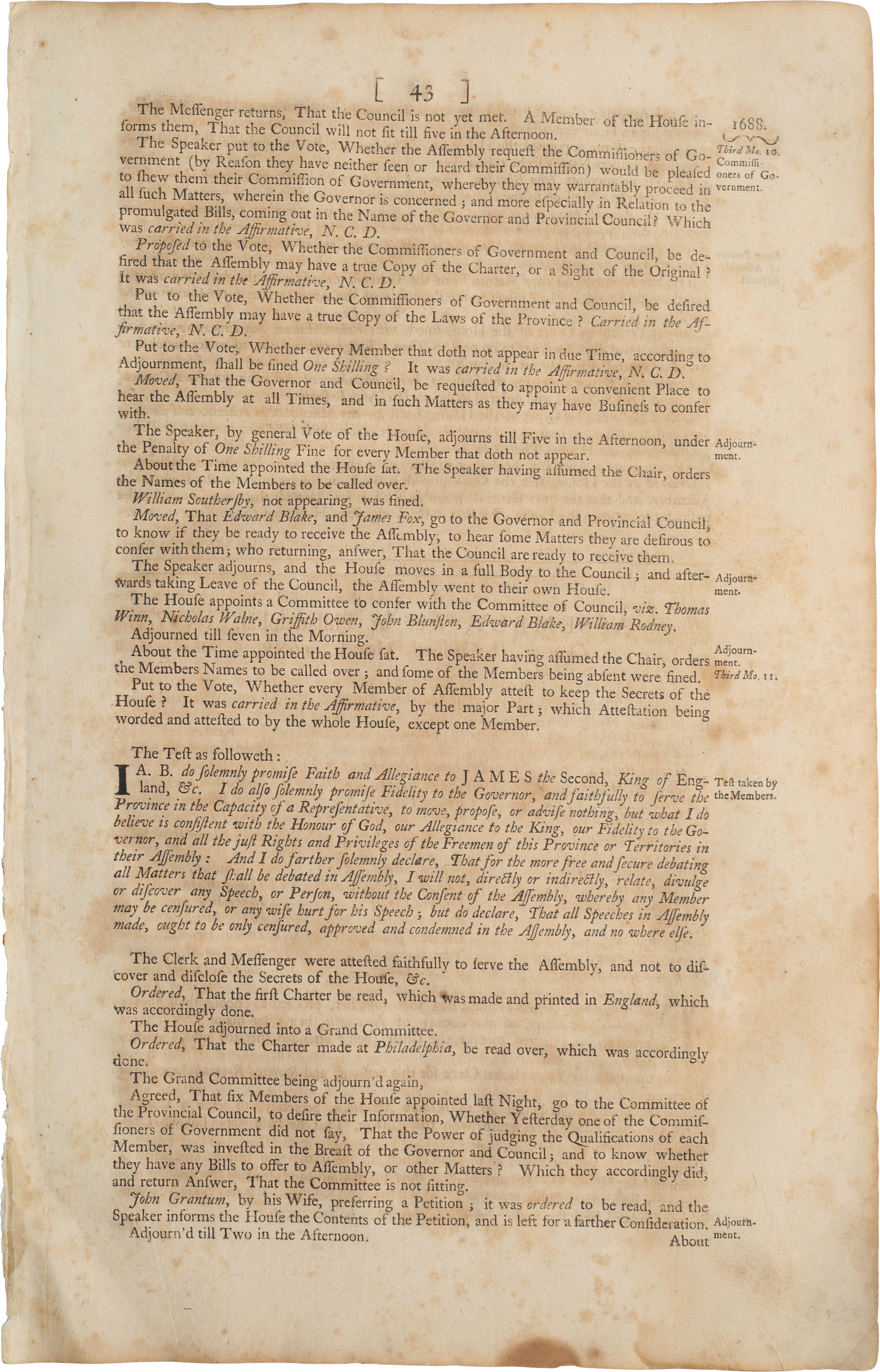 Votes and Proceedings of the House of Representatives of the Province of Pennsylvania. Beginning the Fourth Day of December 1682. First edition of the first volume of three published by Franklin in 1752 covers the political history of Pennsylvania from 1682 up to 1744, including several of the acts that brought Pennsylvania into existence. Large size, 9 5/8” x 14”. Frameable and a wonderful office display for a lawyer, politician, public servant, or of course, printer.