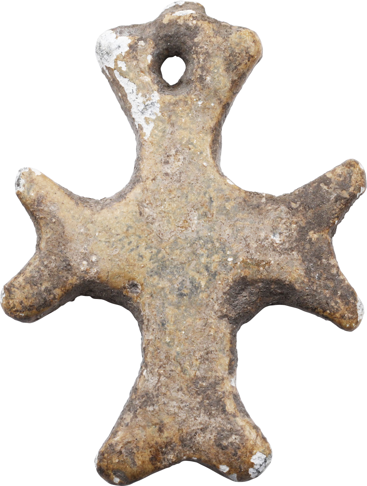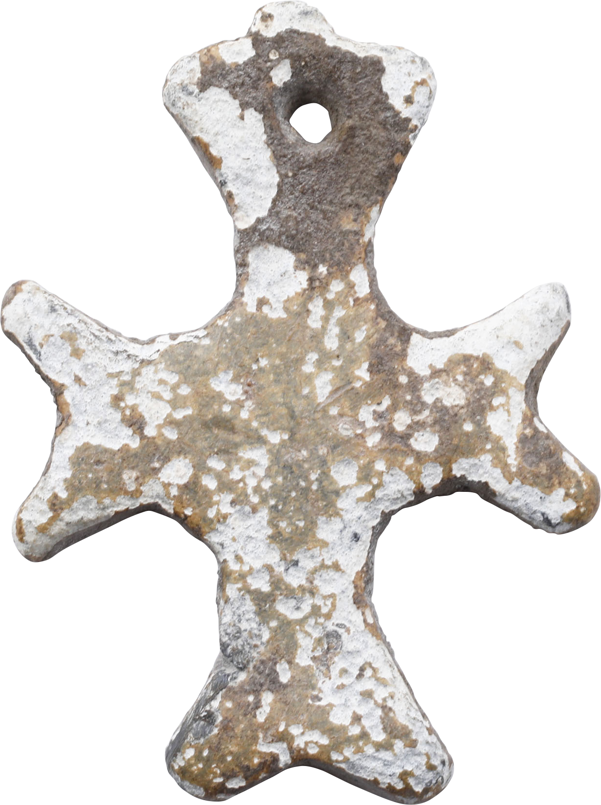 Large example. Lead, about 1 1/2” (1.42”) height. Made for burial with plague victims of the first great plague of 1348-49. The cross beam centered. The beams flared with swallow tail terminals.. Known variously as Pestilence, the Great Mortality, the Great Plague or the Black Death, it was bubonic plague which was brought by sea from France. It killed a quarter of the population of London in two years, creating a shortage of burial space and manpower to perform the burials. Over the centuries, many English churchyards have been cleared of old burials to make space for new (the closer to the church entrance the burial, the greater the chance for eternal happiness) and these crosses are occasionally encountered. See the attached images from the Science Museum, London and four related examples of 1348, from Grey Friars Monastery, Newgate Street, London (Wellcome Library, London).