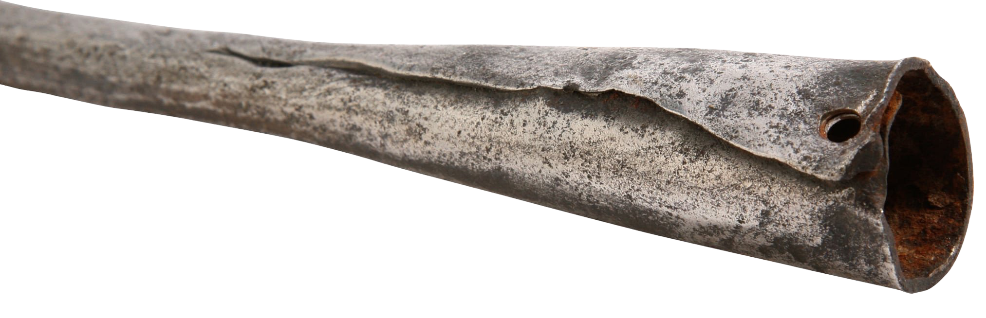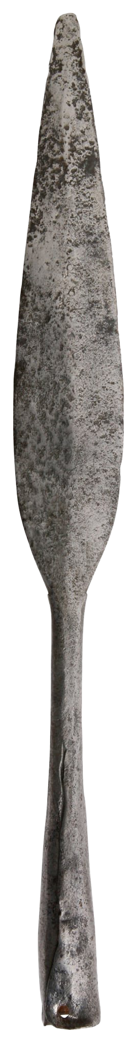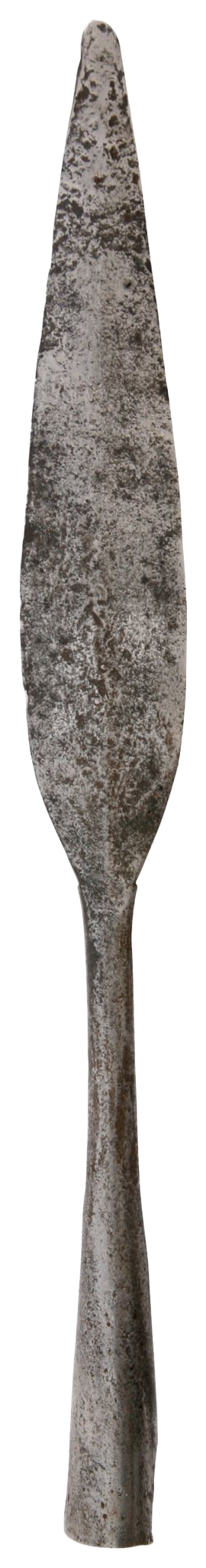 19th century, a universal form that evolved with the melding of tribes in the Congo in the second half of the 19th century. 12 1/2” length with a medially ridged leaf-shaped point on a lapped seam conical socket pierced with a hole for a securing pin. A war spear for the field. At the time wars were made for the sole purpose of capturing enemies for the slave market.