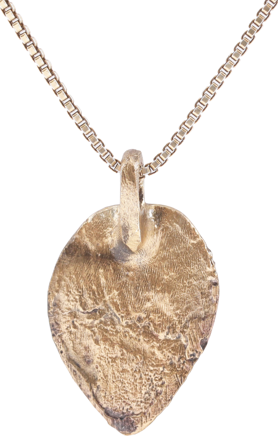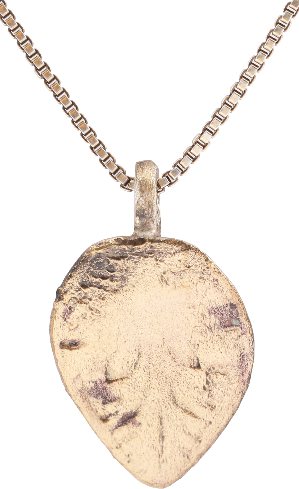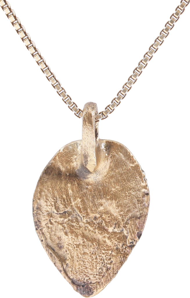 Gilt bronze, form which evolved from the earlier Viking heart pendants. Heart shaped uncusped of flat form with foliate trefoil motif. Each of the three elements as a leafy branch. Low relief, showing wear from its working like and surface texture from burial. Professionally refurbished with the 24karat gold surface restored on an 18” gilt sterling silver neck chain for modern wear. Gift boxed with certificate of authenticity.