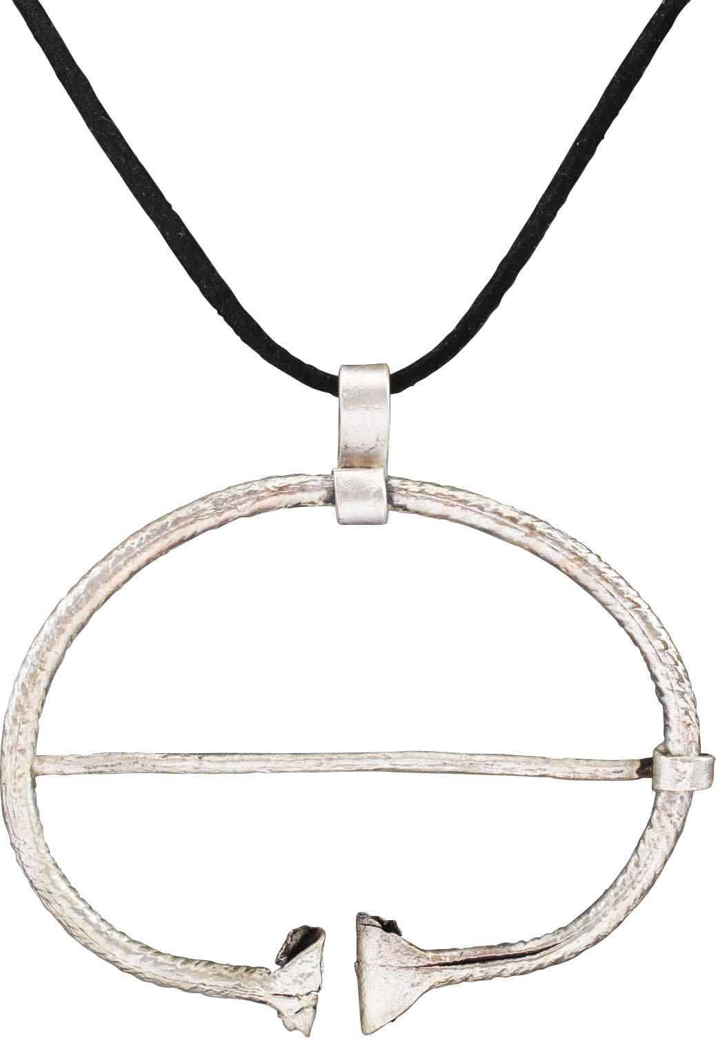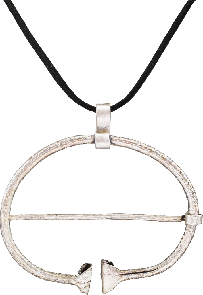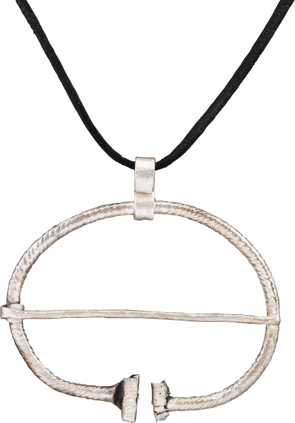 About 2 3/4” (2.74”) width, oval and roped form. The reeded ends curled. Original cross pin. Worn in numbers on the leather war jerkin, at an ounce each, a few pounds could be added providing significant protection against sword blows. See current Public Broadcasting for Vikings wearing a protective brooch. Light texture from burial and the pure silver surface renewed. Mounted with an 18” modern Sterling silver mounted polished leather neck cord for modern wear. Jewelry gift boxed with a certificate of authenticity.