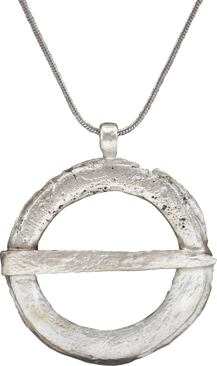 Silvered bronze, worn in numbers on the surface of the jerkin, to provide a measure of protection against sword cuts and, in fact, were a form of armor. See current Public Television programming for documentation of these in action. As protectors, they also held spiritual significance for the warrior. Circular, under 1 ½” (1.44”) with broad low rounded face, ridged edges and flat back. The surface textured and worn from burial. Professionally refurbished with the silver overlay restored, on an 18” Sterling silver mounted polished leather neck cord for contemporary wear. Jewelry gift boxed with a certificate of authenticity. Fine proud form.