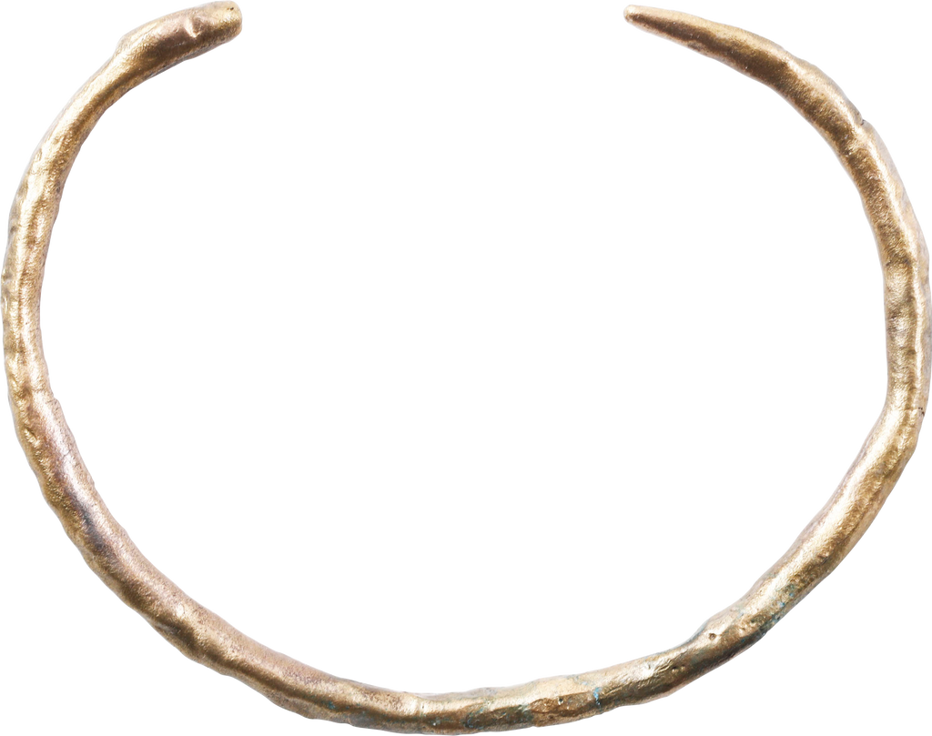 Gilt bronze, 2 3/8” (2.33”) inside dimension. Oval section. One end characterfully modeled as a stylized snake’s head. The other end as a tail. Surface textured from burial. Professionally refurbished with the 24karat gold surface restored. Jewelry gift boxed with certificate of authenticity. A substantial bracelet of classic Viking workmanship made 1000 years ago and perfectly suited for modern wear.