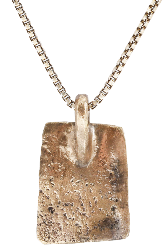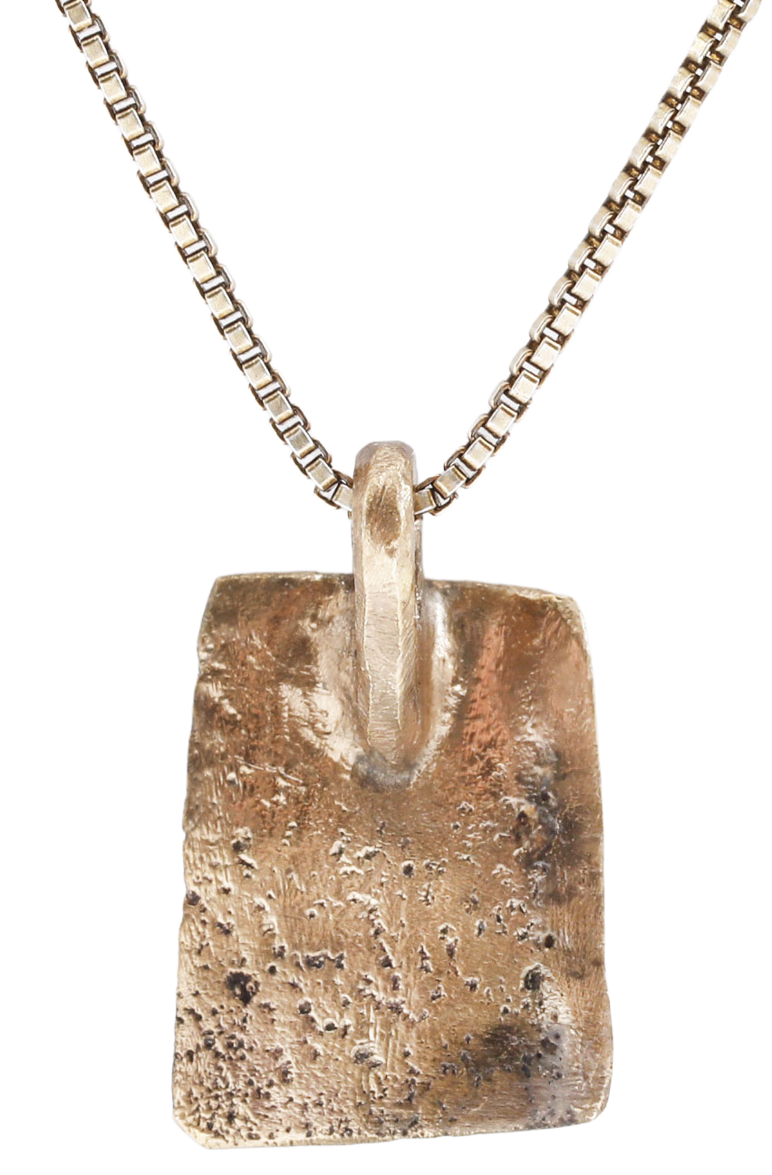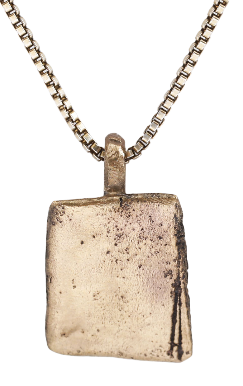 As Vikings were highly skilled metallurgists, breaking metal had supernatural significance for them. Breaking ringjarn (iron rings) as shown on the Larbro Stone, was thought to destroy the spirits of enemies. Similarly, Viking weapons and accouterments were broken for burial with their owners. This is the broken segment of a Viking woman warrior's bronze bracelet. It is about 3/8” by 1/2” with one rounded edge and an incised line on the other. The surface is lightly textured from burial.  It was handcrafted by a Viking artisan 1000 years ago! It has been professionally refurbished with a 24karat gold overlay and mounted to an 18” gilt Sterling silver neck chain for modern wear. It comes with certification of authenticity, and gift boxed.