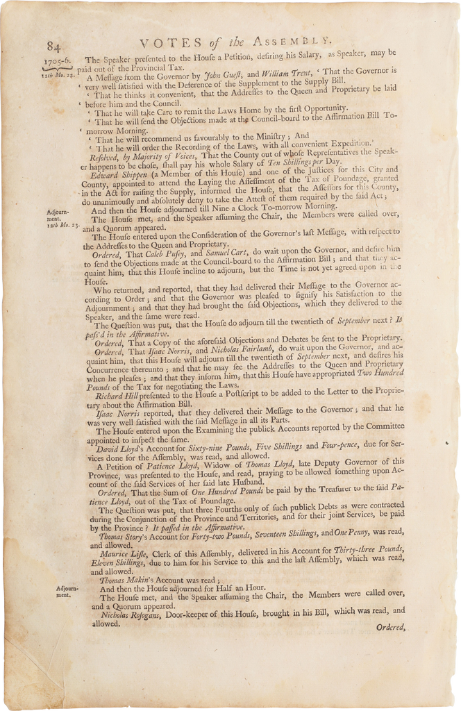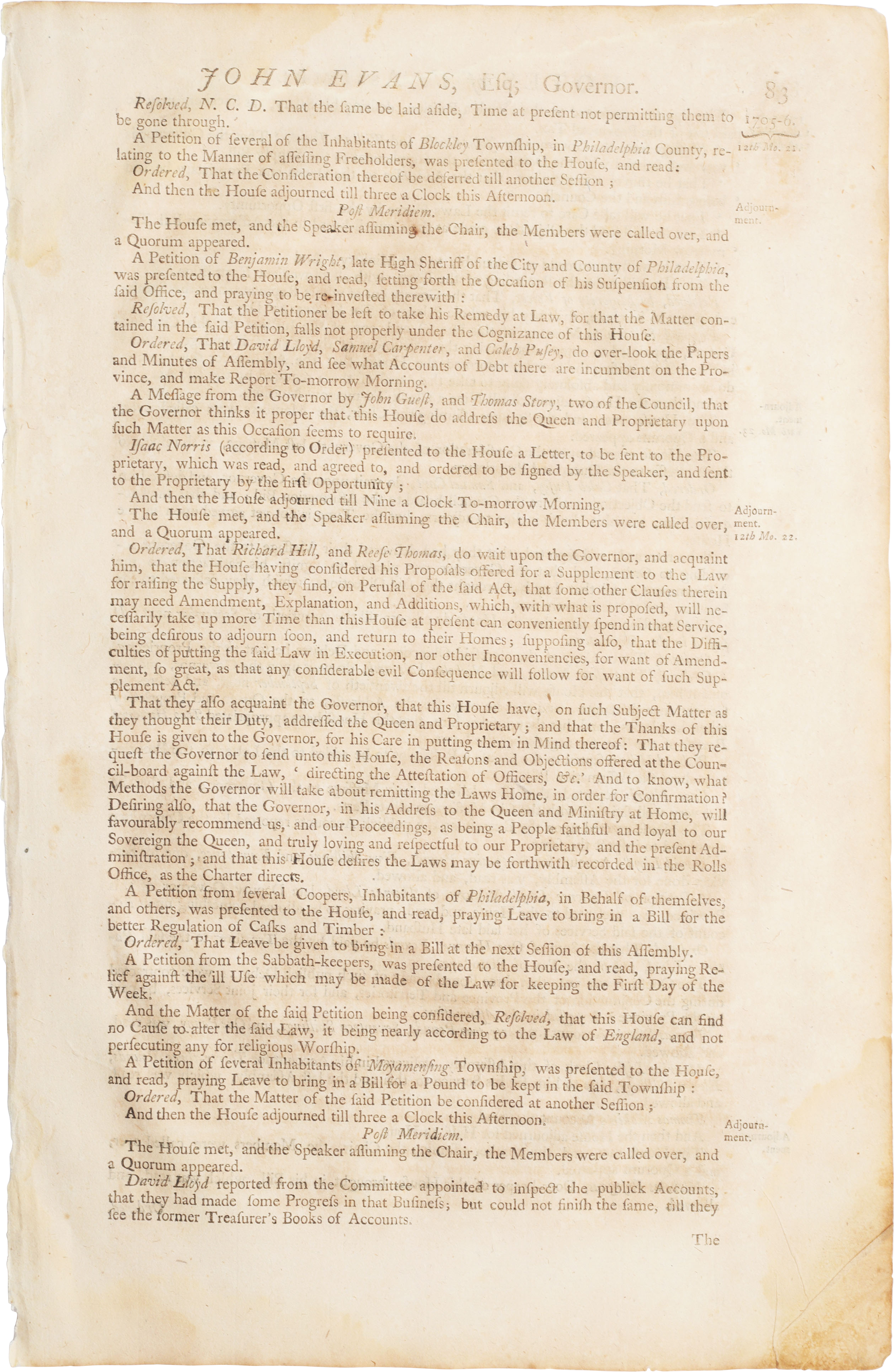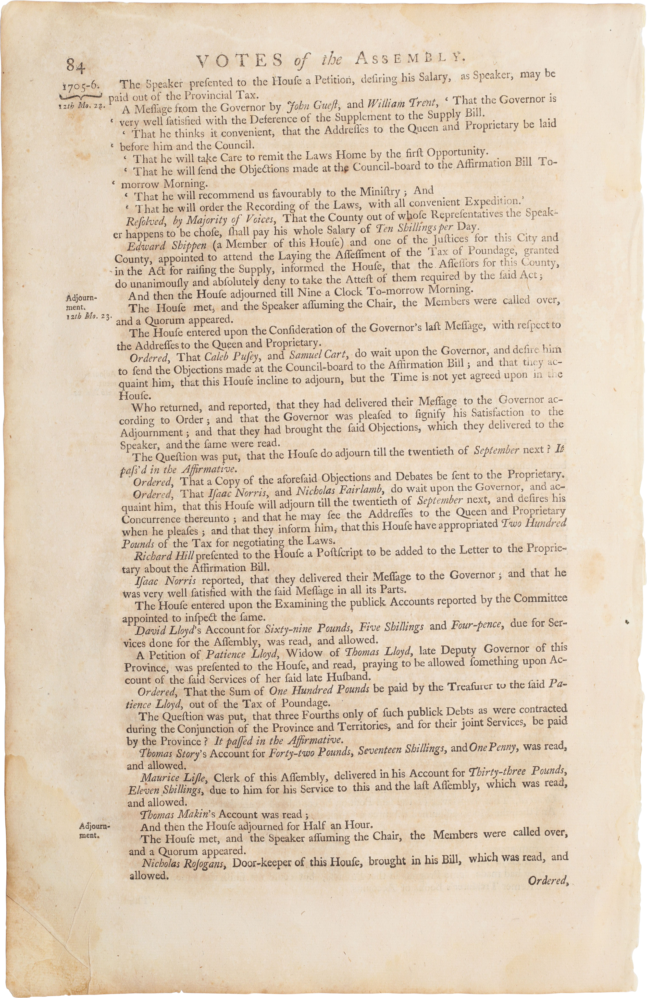 Votes and Proceedings of the House of Representatives of the Province of Pennsylvania. Beginning the Fourth Day of December 1682. First edition of the first volume of three published by Franklin in 1752 covers the political history of Pennsylvania from 1682 up to 1744, including several of the acts that brought Pennsylvania into existence.  Large size, 9 5/8” x 14”. Frameable and a wonderful office display for a lawyer, politician, public servant, or of course, printer.