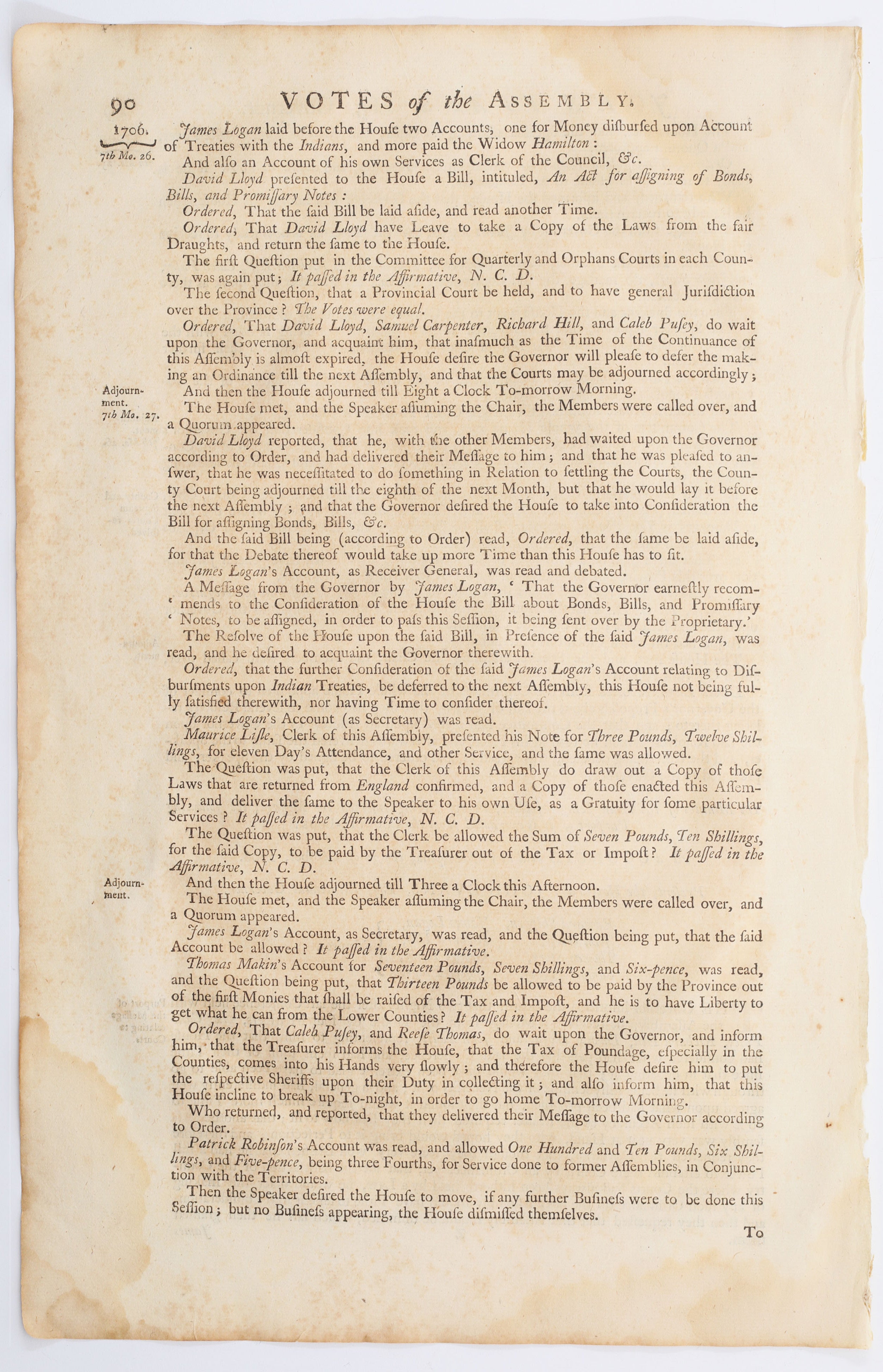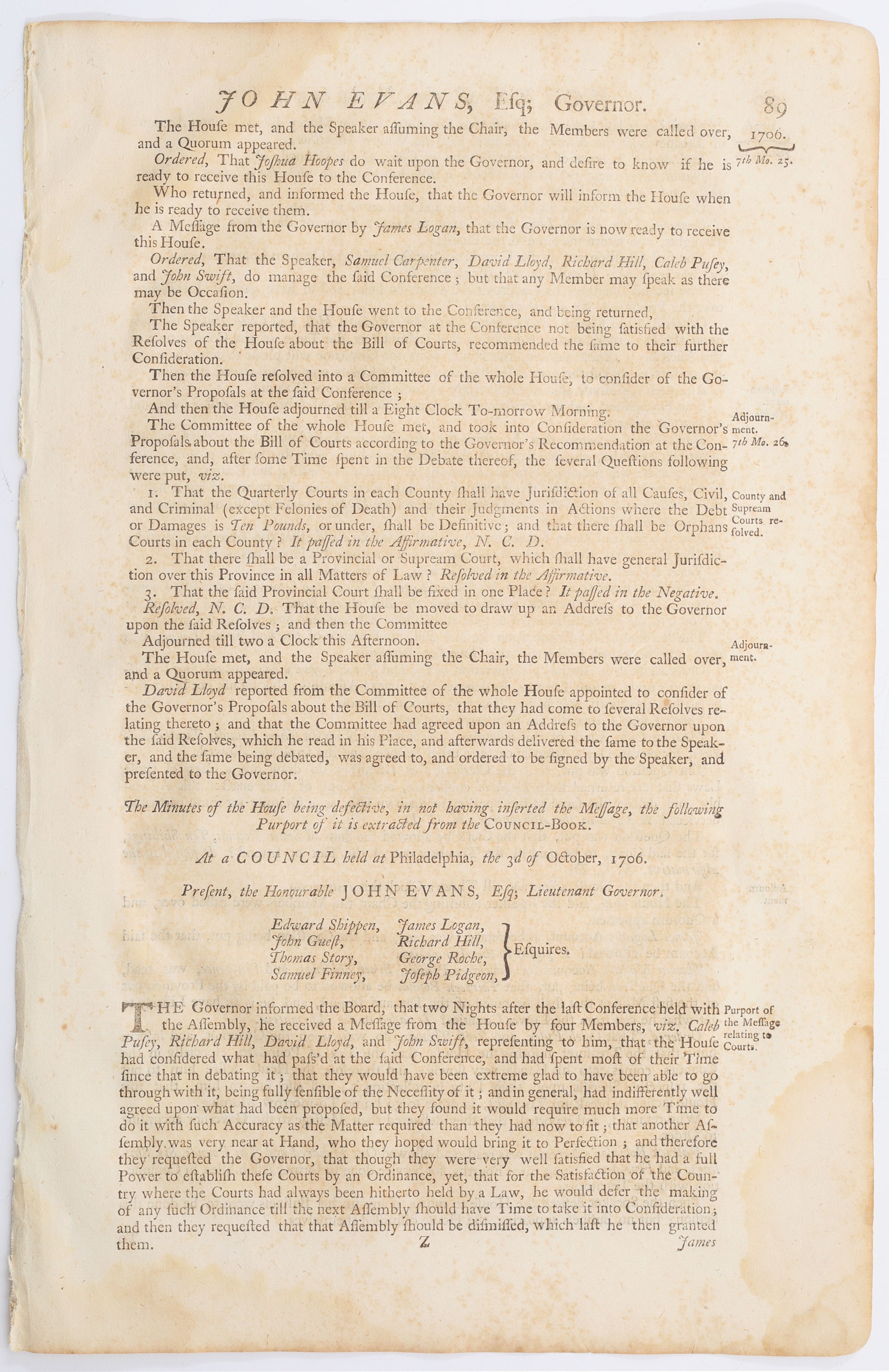 Votes and Proceedings of the House of Representatives of the Province of Pennsylvania. Beginning the Fourth Day of December 1682. First edition of the first volume of three published by Franklin in 1752 covers the political history of Pennsylvania from 1682 up to 1744, including several of the acts that brought Pennsylvania into existence.  Large size, 9 5/8” x 14”. Frameable and a wonderful office display for a lawyer, politician, public servant, or of course, printer.