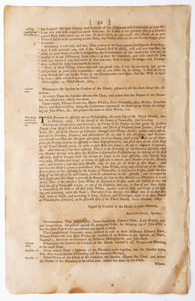 Votes and Proceedings of the House of Representatives of the Province of Pennsylvania. Beginning the Fourth Day of December 1682. First edition of the first volume of three published by Franklin in 1752 covers the political history of Pennsylvania from 1682 up to 1744, including several of the acts that brought Pennsylvania into existence. Large size, 9 5/8” x 14”. Frameable and a wonderful office display for a lawyer, politician, public servant, or of course, printer.