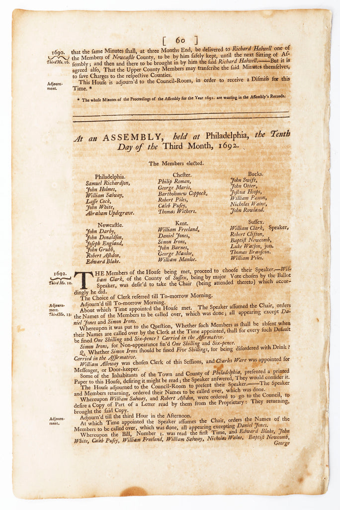 Votes and Proceedings of the House of Representatives of the Province of Pennsylvania. Beginning the Fourth Day of December 1682. First edition of the first volume of three published by Franklin in 1752 covers the political history of Pennsylvania from 1682 up to 1744, including several of the acts that brought Pennsylvania into existence. Large size, 9 5/8” x 14”. Frameable and a wonderful office display for a lawyer, politician, public servant, or of course, printer.