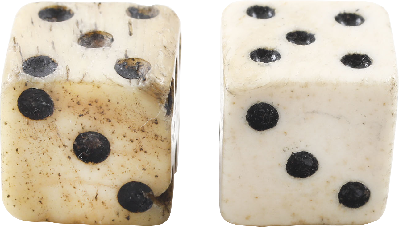 Pair, ½" cubical. Hand-made with some irregularity to the black inked pips as expected. Produced by cottage industries, often on plantations to supplement agricultural revenue, they were produced in large lots. Any pair will vary with hand workmanship and may include bone of slightly different colors, from different batches which vary according to drying time.