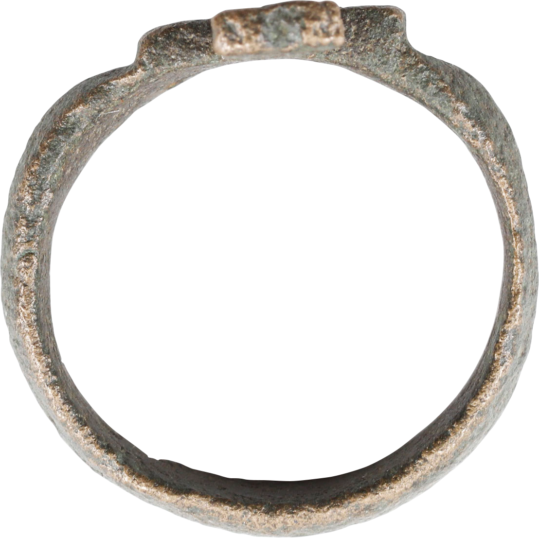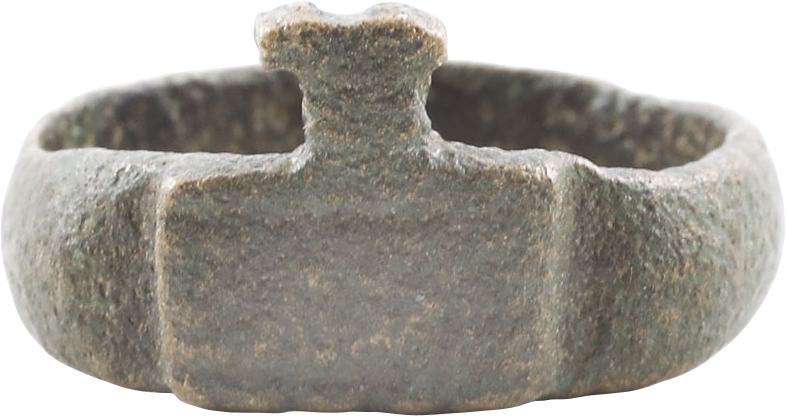 Bronze, size 8 1/2. Rounded face band, 5.9mm width, with raised rectangular bezel with integral diminutive key bit. These rings were used to open jewelry boxes, the ownership of which was prestigious. As a result, many were made for show only and worn where no such box existed. This example was likely a prestige statement for a woman of fashion. As found condition with light surface texture and dark uniform patina. Jewelry gift boxed with certificate of authenticity.