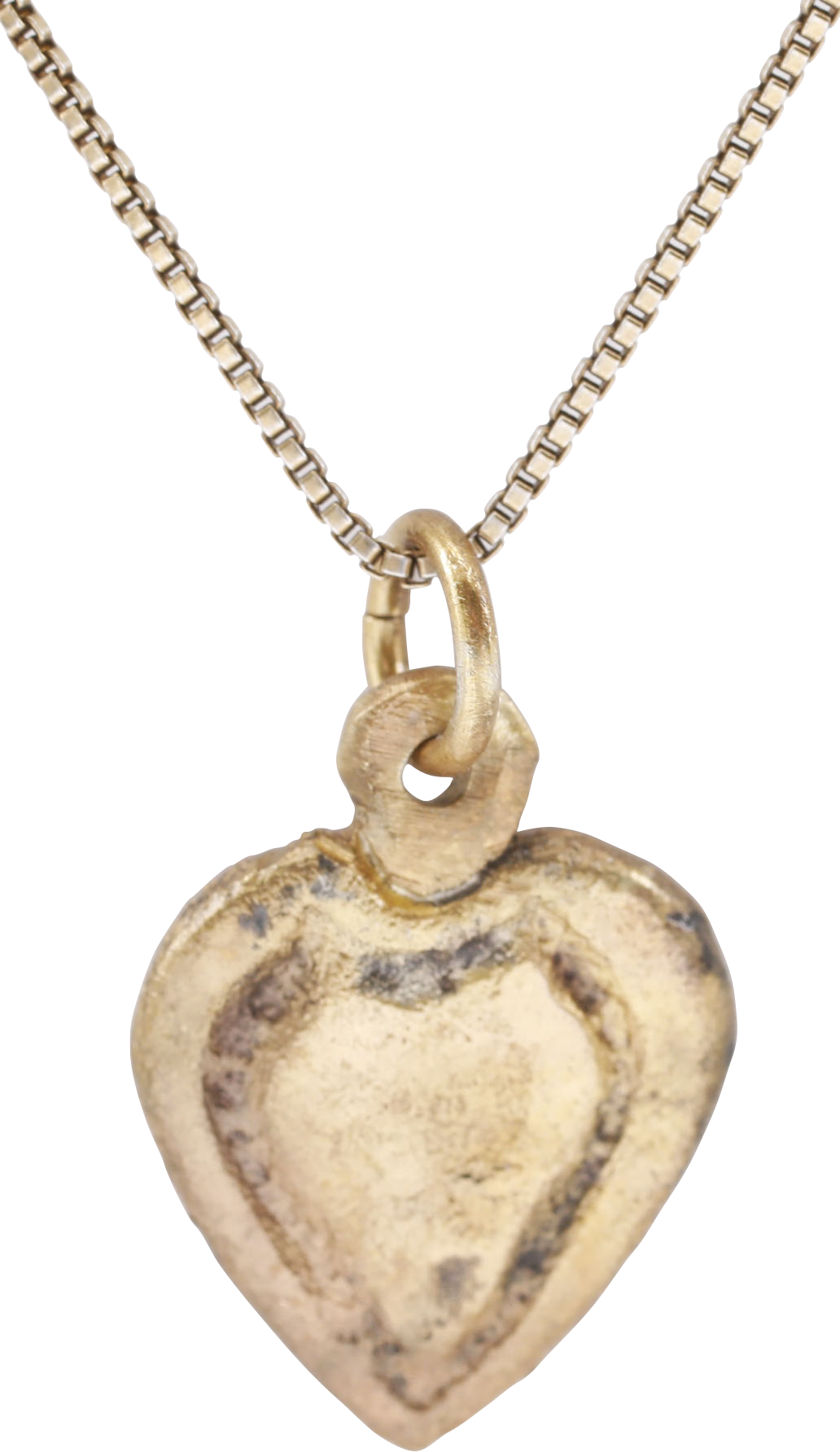 Gilt bronze. Charm size, just over 5/8” (0.63”) height plus the loop. Iconic cusped top heart form with broad rounded edge enclosing Another heart. A heart within a heart! The heart stood for bravery, fortitude, loyalty, and integrity, all attributes of the Viking warrior. It is abundantly referenced in Viking literature. Surface textured from burial. Professionally refurbished with the 24karat gold overlay restored on an 18” gilt Sterling silver neck chain for modern wear. Gift boxed with certificate of authenticity.