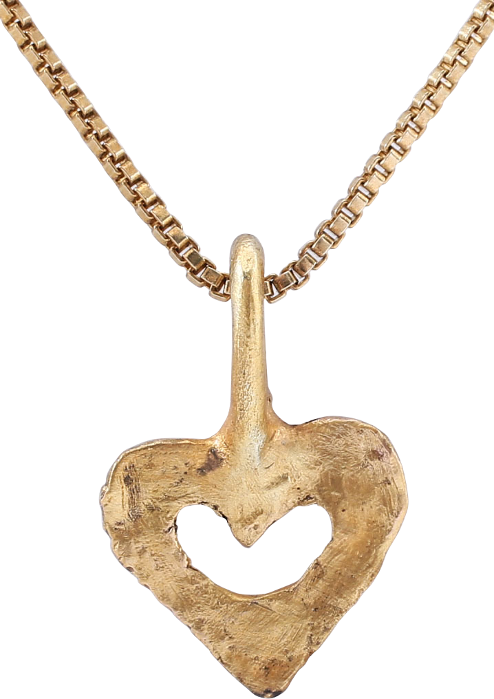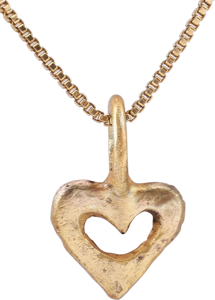Gilt bronze. Charm size, just 3/8 (0.37”) height plus the loop. Iconic cusped top heart form pierced with a heart. A heart within a heart! The heart stood for bravery, fortitude, loyalty, and integrity, all attributes of the Viking warrior. It is abundantly referenced in Viking literature. Surface textured from burial. Professionally refurbished with the 24karat gold overlay restored on an 18” gilt Sterling silver neck chain for contemporary wear. Gift boxed with certificate of authenticity. About as small as these come!