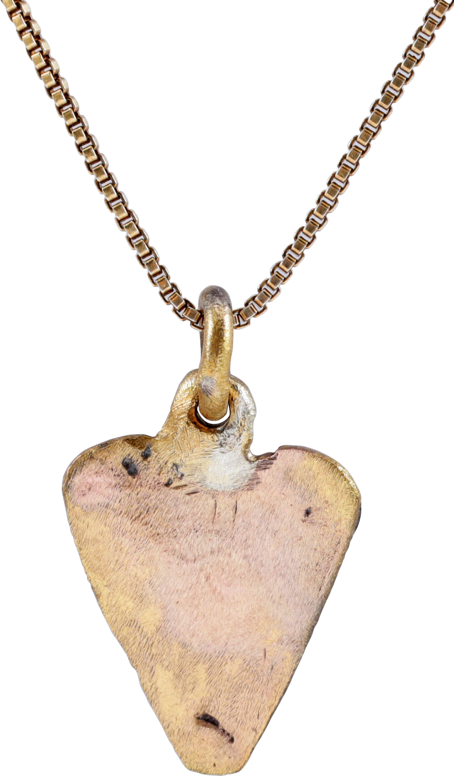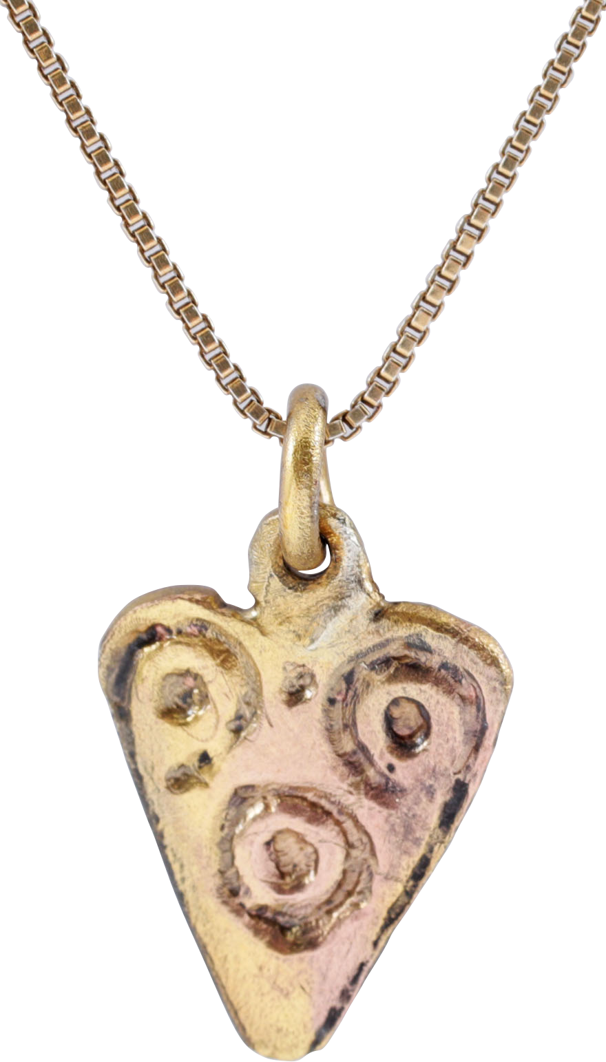 British Isles. Gilt bronze. Charm size, just under 5/8” (0.62”) height plus the loop. Iconic cusped top heart form enclosing three dot and circle motifs. The upper two formed by the extensions of the border. The heart stood for bravery, fortitude, loyalty, and integrity, all attributes of the Viking warrior. It is abundantly referenced in Viking literature. Surface textured from burial. Professionally refurbished with the 24karat gold overlay restored on an 18” gilt Sterling silver neck chain for contemporary wear. Gift boxed with certificate of authenticity.