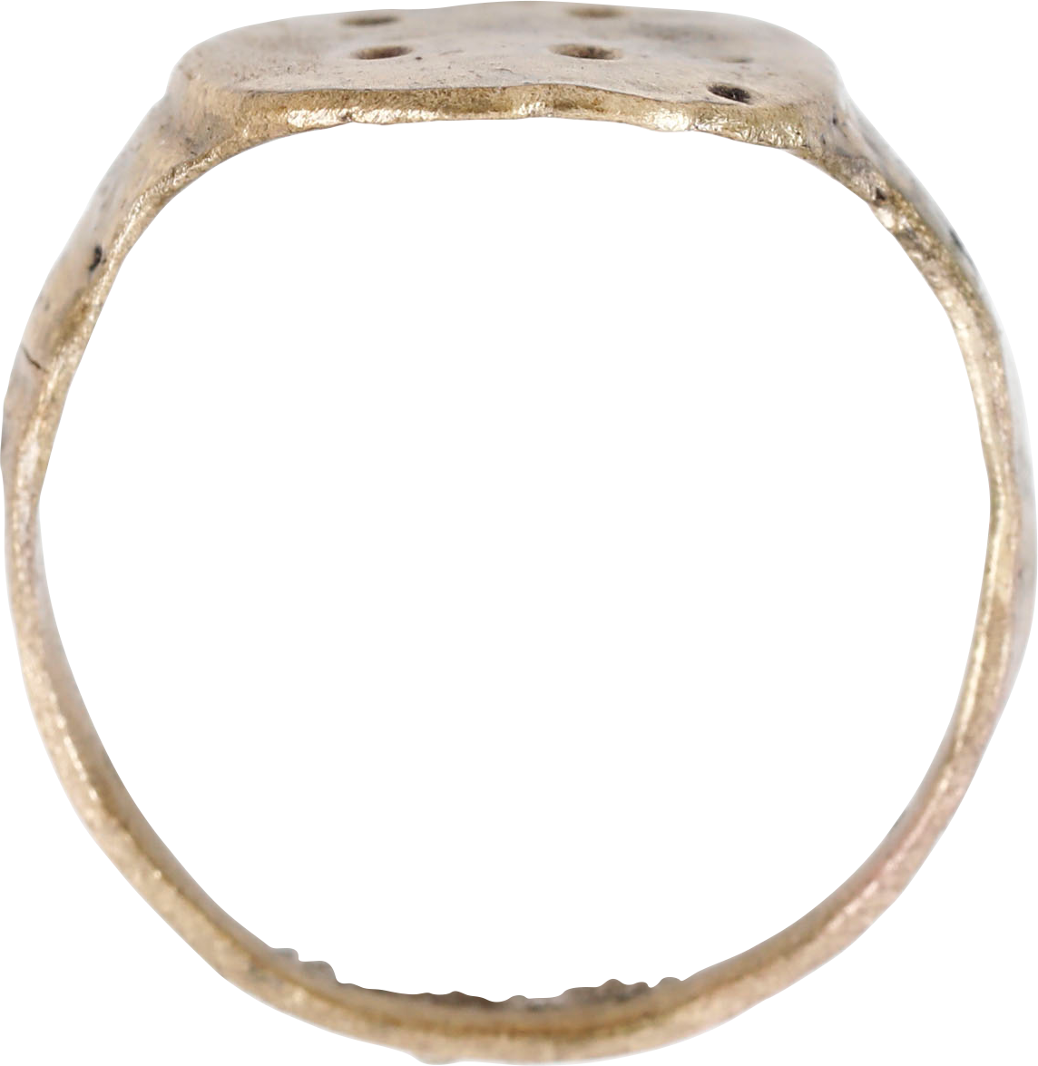 Iconic form as found in England in the pre-Viking and Early Viking period. Size 10 3/4 with 3.4mm flat face band. Broad flat bezel with a cluster of dots. See Ancient Rings, Pollio, p.42, lower left for a near-identical example. The arrangement of the circles is near-symmetrical with smaller dots out of place. The skill required to produce the rings belies the concept that the spacing is random, though its significance, undoubtedly spiritual, is now lost. Rings of this type have been found along the route to the Holy Land, and pilgrim badges are commonly found in England. After Viking settlements were established, something under half of English soil was still occupied by Anglo Saxons who frequently fought the Vikings. Professionally refurbished with the 24karat gold overlay restored. Gift boxed with a certificate of authenticity.