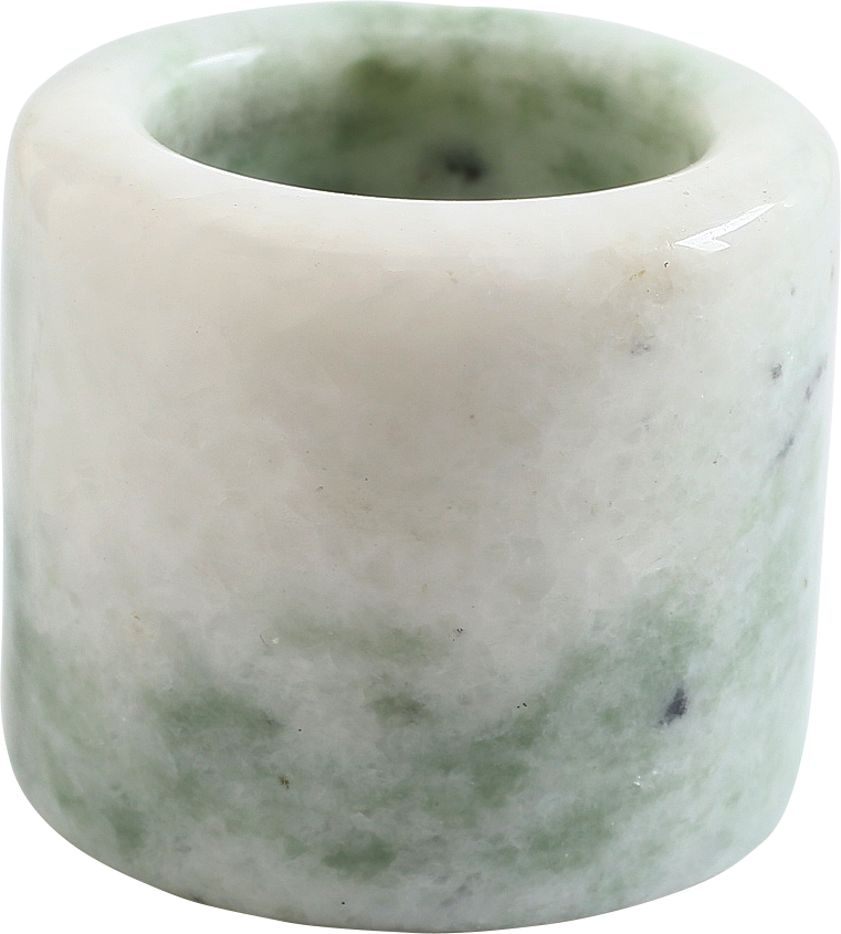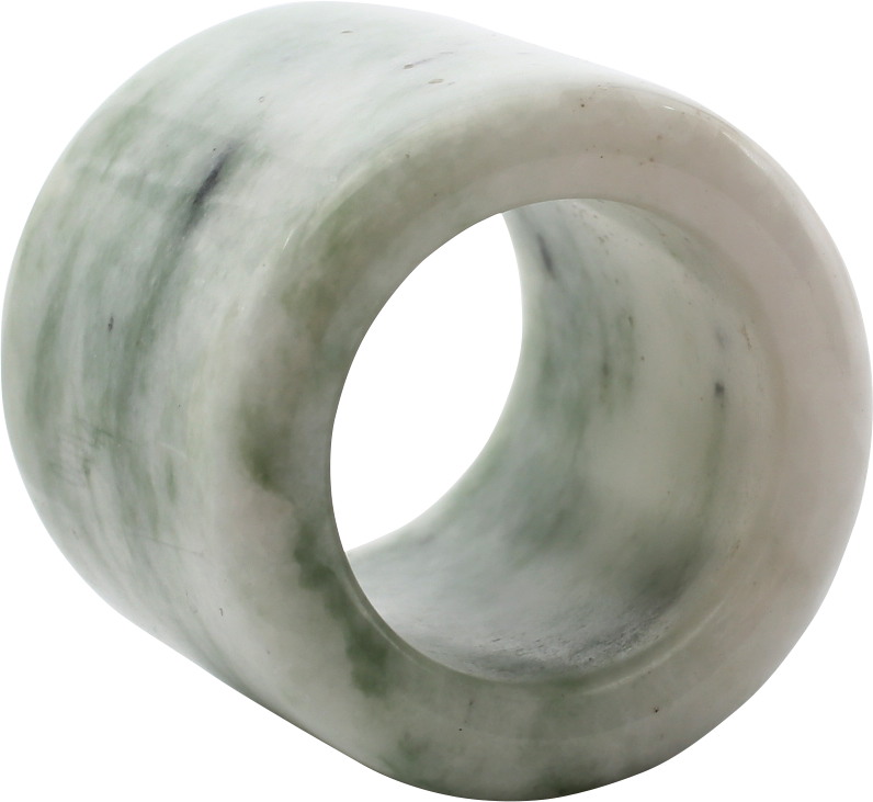 Variegated green jade, 1.20” height and 1.37” outer diameter. The ends with corresponding bevels. The stone was selected for its rich contrasting grain. Contrary to common misinformation, these did not protect the thumb. They facilitated the Mongolian release, with the string engaged on the back edge and sliding off for a more precise release than the European pinch release.