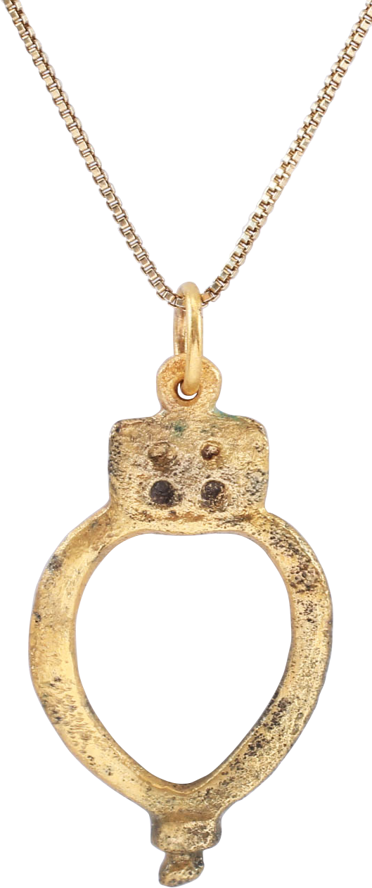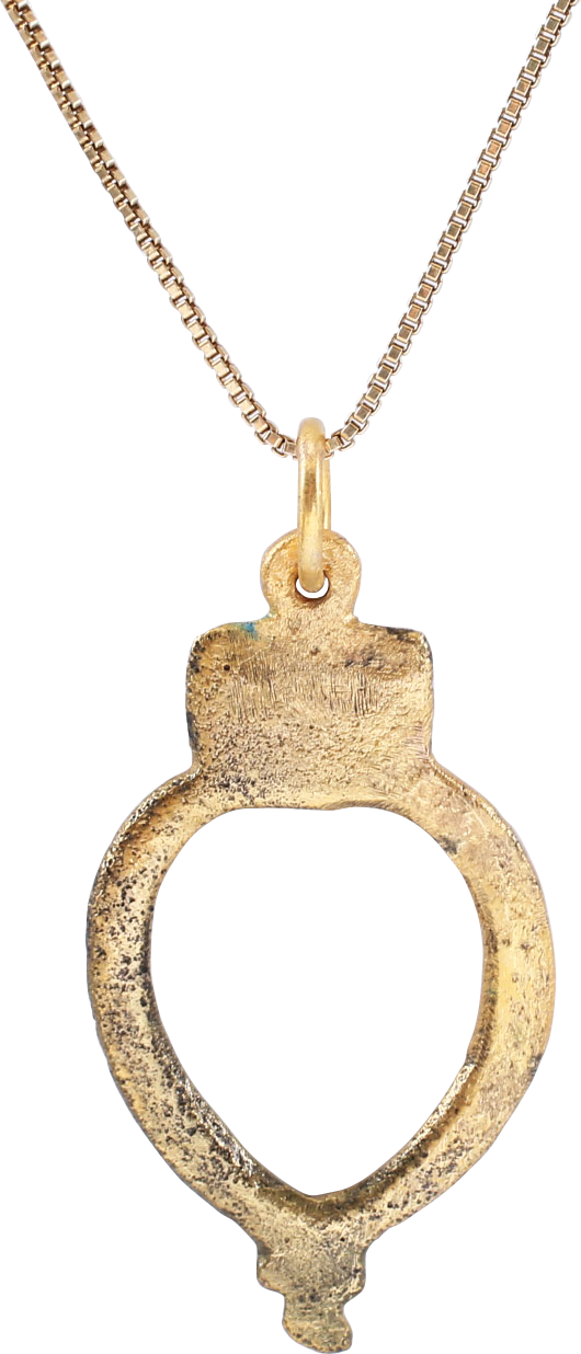 Gilt bronze, 1 3/8” (1.39”) height formed as a heart below a four dot cluster. Both elements are drawn from heritage, the heart replicating the Viking heart and the matrix, an iconic Anglo-Saxon symbol. Post Norman conquest, these symbols embody the heritage of the wearer, evidently a blending of the two cultures, in centuries past. Professionally refurbished with the 24karat gold surface restored, on an 18” gilt silver neck chain for modern wear. Jewelry gift boxed with certificate of authenticity.