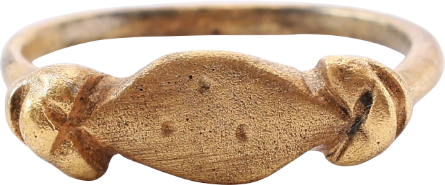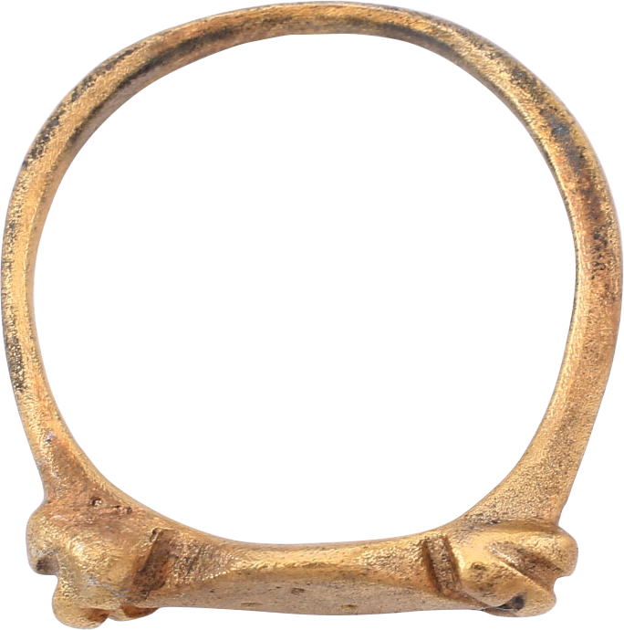 During the Renaissance, the act of committing to marriage took place as a formal ceremony with vows, considered sacred and unbreakable, exchanged. A ring was given by the man to the woman to bind the pledge and worn until the marriage. That practice is believed to derive from the custom of providing a bride’s price or dowry. This example is size 9 1/2 with lenticular bezel supported by knot form ends cut with x’s or saltires. Exceptional preservation.  Professionally refurbished with the 24karat gold surface restored and is gift boxed with certificate of authenticity.