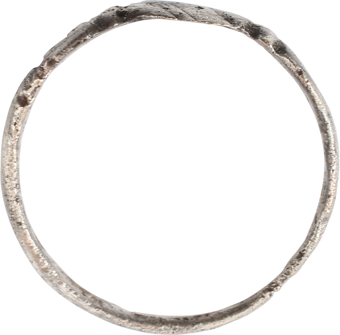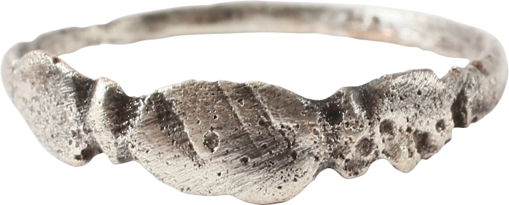 Silvered bronze, size 7 1/2 with a narrow band and central swelled motif of the shaking hands (dexiosis) which is known in European art for at least two millennia, flanked by heart motifs. Surface texture from burial. Professionally refurbished with the pure silver surface restored and gift boxed with a certificate of authenticity. Good wearable size.