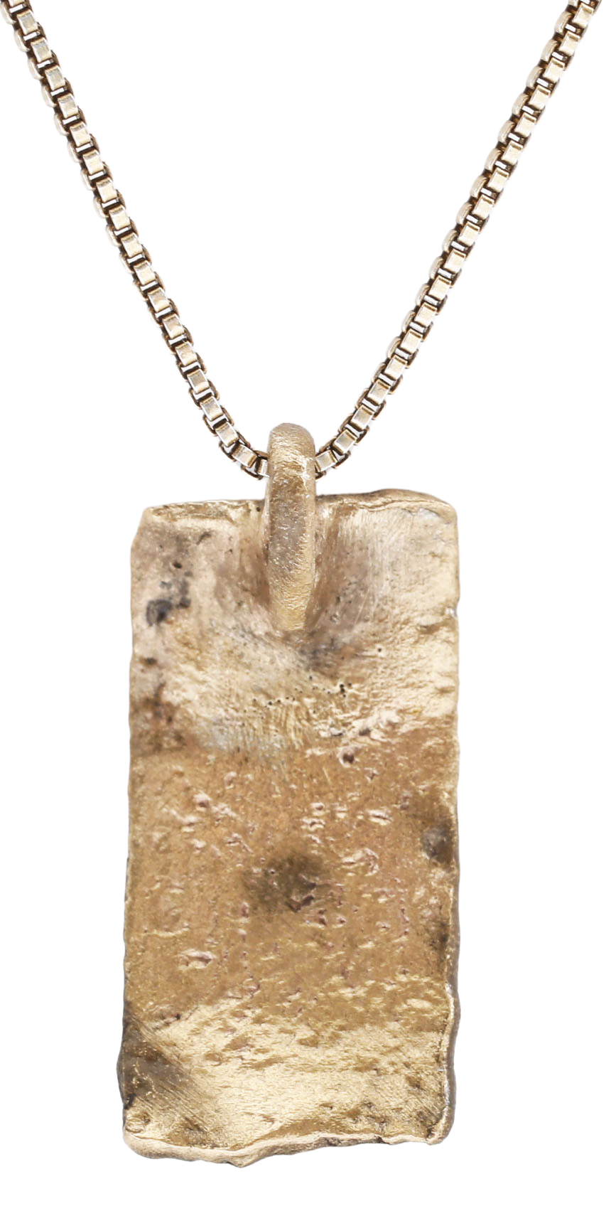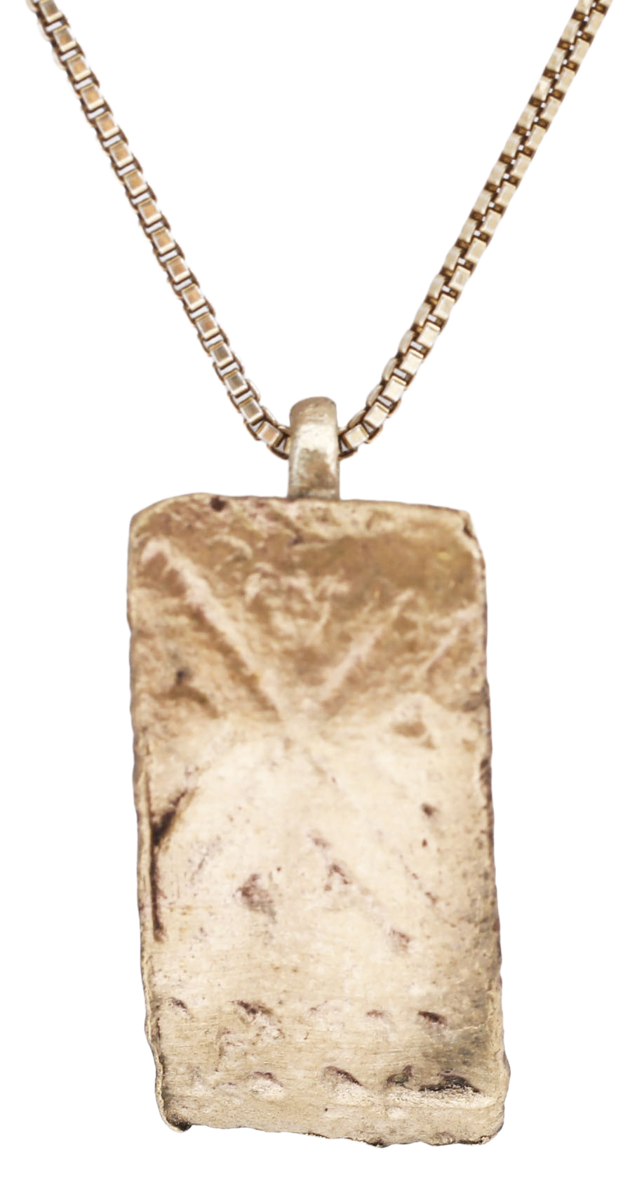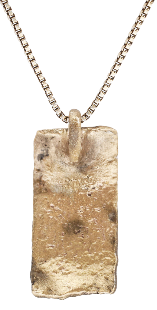 Vikings were highly skilled metallurgists, and as a result, breaking metal had supernatural significance for them. Breaking ringjarn (iron rings) as shown on the Larbro Stone in Gotland Sweden, was thought to destroy the spirits of enemies. Similarly, Viking weapons and accouterments were broken for burial with their owners. This is the broken end of a fine Viking warrior’s bronze bracelet. It is about 3/4” x 3/8” and decorated an elongated saltire with curvilinear figures in the  inside angles, over a double stipple band on the end. It is lightly worn  from burial. It has been professionally refurbished with a 24karat gold overlay and mounted to an 18” gilt Sterling silver neck chain for modern wear. It comes with a certification of authenticity and is gift boxed.