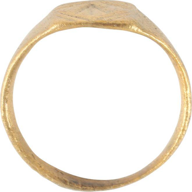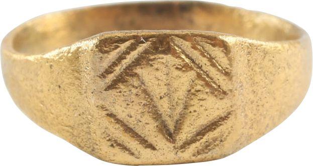 Bronze, size 3 ¾ with rounded face band flared to the shoulders. Square bezel with central trefoil and angled hash marks to the corners. The term Byzantine was introduced in the Victorian period. At the time, the term Roman was used despite the fall of the Roman Empire. Professionally refurbished with the gold surface restored.