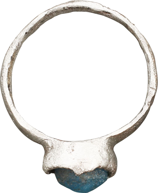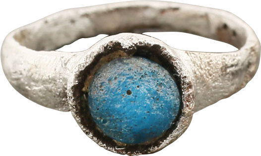Silvered bronze with a blue “stone” probably glass. Size 5 ¼ with 2.4mm rounded face band flared to the shoulders. Tall cylindrical bezel mounted with a rounded face bleu “stone” probably a flat back cabochon. The stone surface frosted from burial. The ring professionally refurbished with the silver surface restored. Jewelry gift boxed with certificate of authenticity.