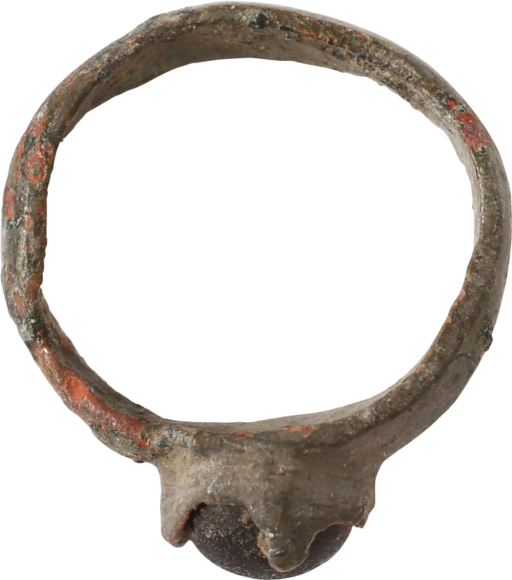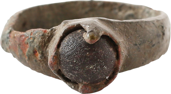 Size 4 1/2, estimated as it is oval. Wideband, 3.6mm, copper, with rounded face. Circular bezel with a red "stone", original and possibly a gemstone. Uncleaned as found and stone degraded from burial. Gift boxed with certificate of authenticity. Dating to the period of popularity of the wearing of rings by commoners. This ring would have been worn by a merchant class woman.