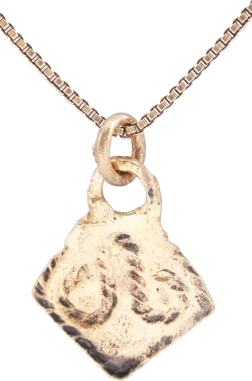 10th-11th century AD. Just over 5/8” (0.65”) height. Gilt bronze shaped as a duck’s foot with roped edges (the spiral or helix held supernatural significance Vikings) and s central roped motif. A burial at Fyrkat, Denmark contained the body of a woman of wealth and status buried with henbane seeds, which have hallucinogenic properties, and a wand as well as other objects. From these, archeologists concluded that she was a seeress or sorceress. (Among Vikings, only women were sorcerers). The grave contained a necklace hung with three duck feet pendants. Professionally refurbished with the 24karat gold surface restored, on an 18” gilt Sterling silver neck chain for modern wear. Jewelry gift boxed with certificate of authenticity. Rare variation.