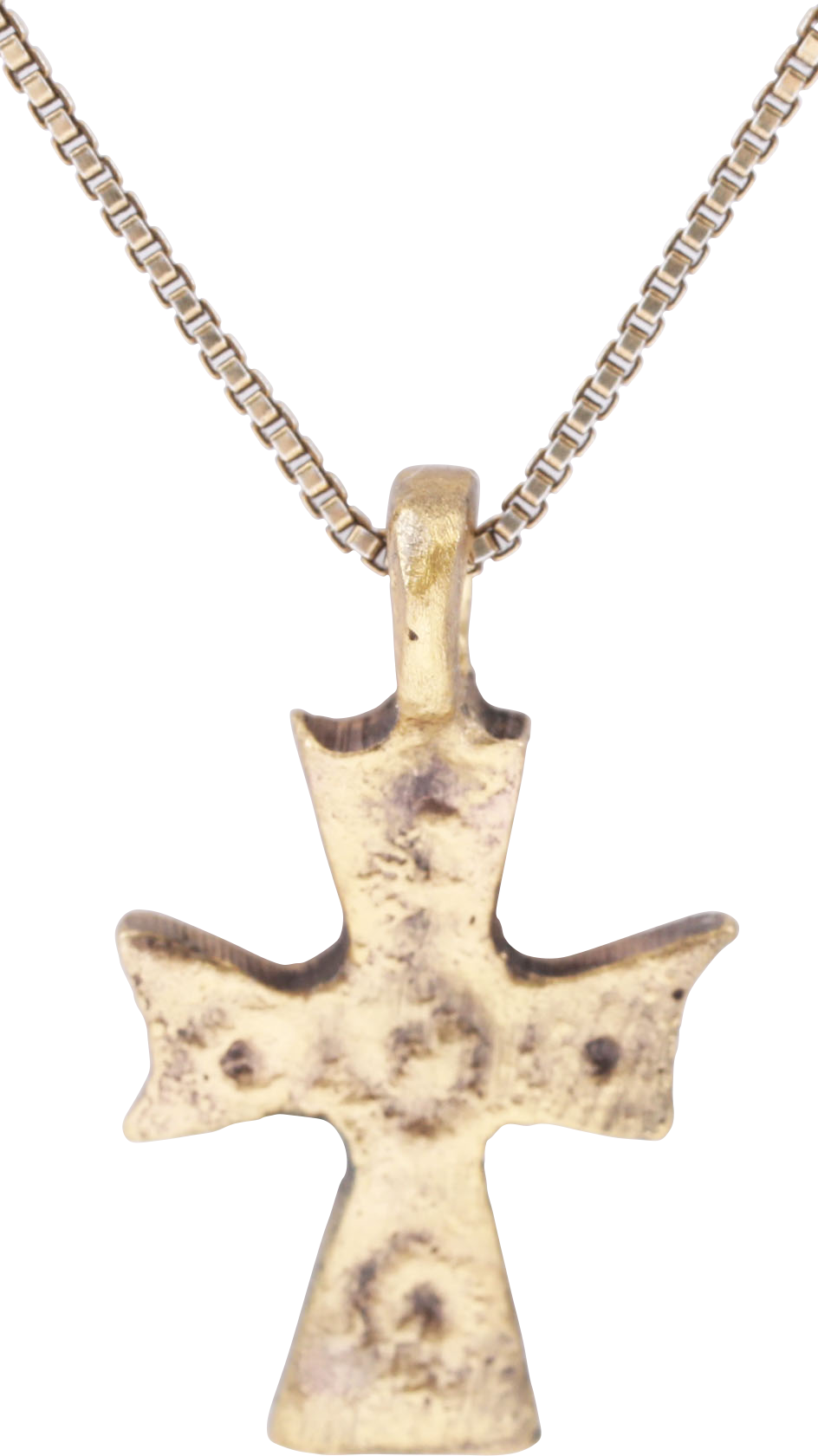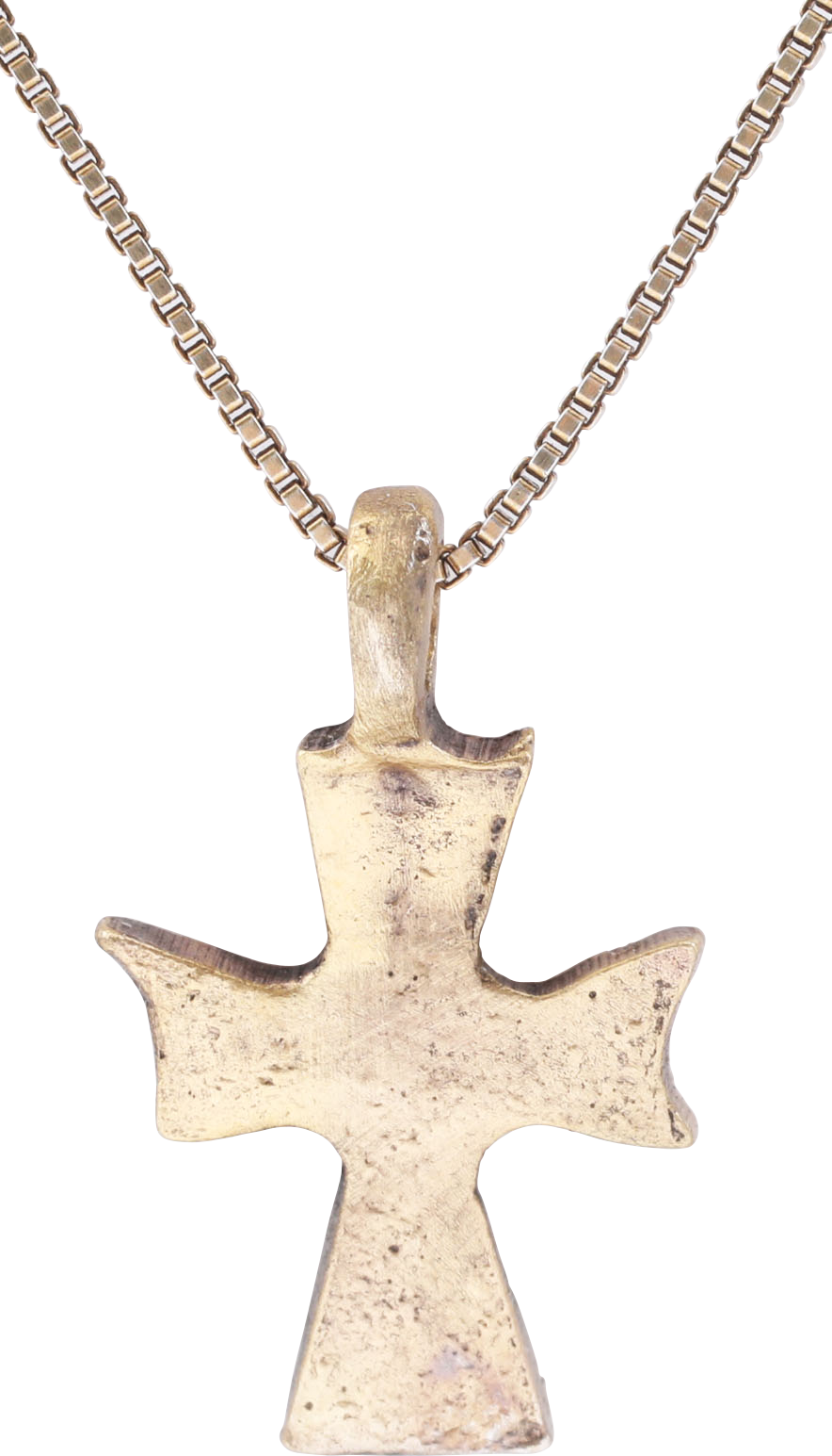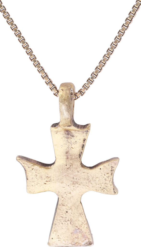 Gilt bronze, 7/8” (0.88”) total height. The cross beam above center. The beams flared from the junction in the Maltese Cross fashion. The center and each beam extension with a circle and dot motif commemorating the five wounds of Christ. Professionally refurbished with the 24karat gold surface renewed, on an 18” gilt silver neck chain for modern wear. Gift boxed with certificate of authenticity.