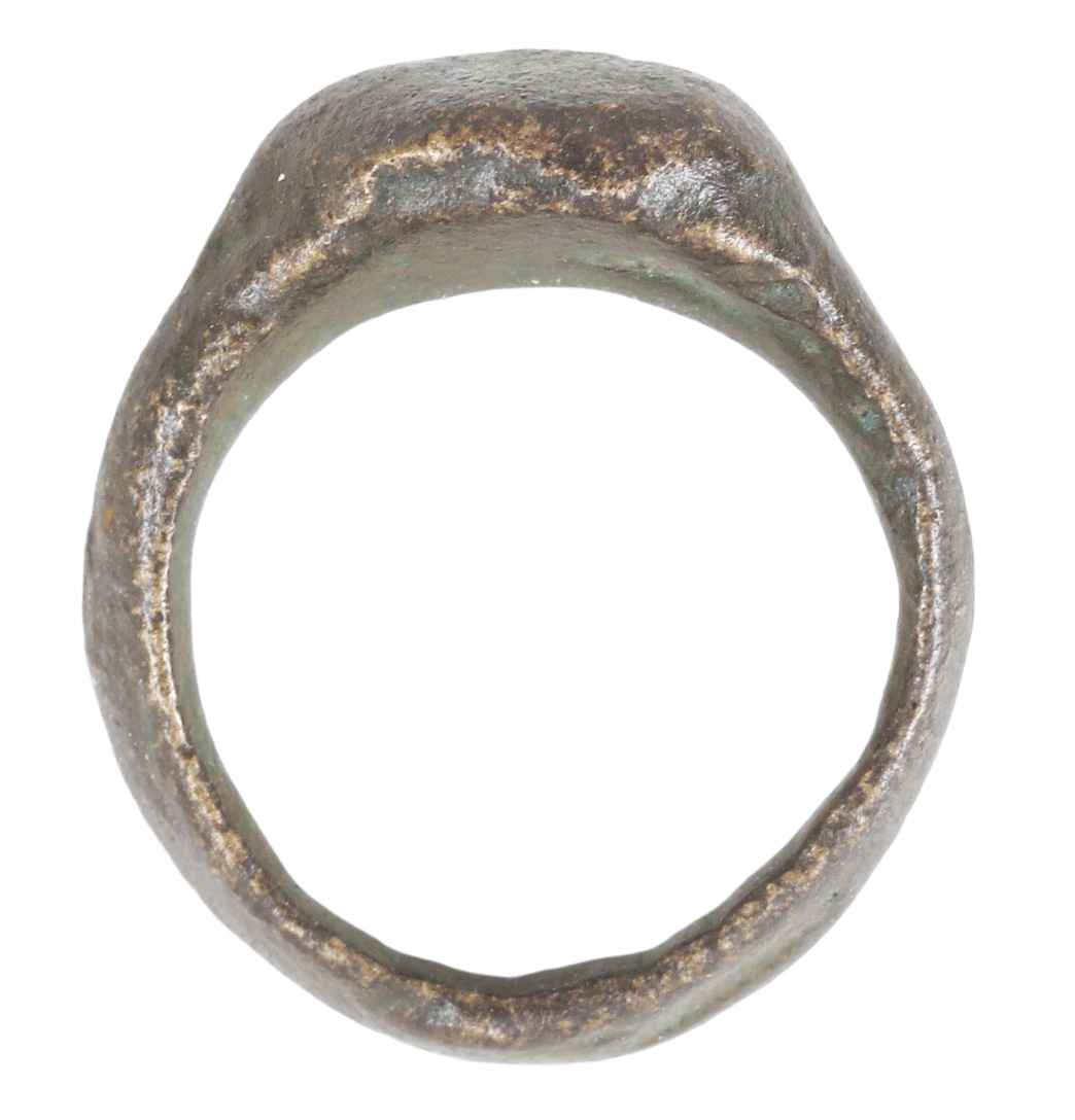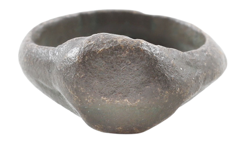 Cast bronze, very small size for a child. 1.7mm ridged band thickened at the bottom. Raised oval bezel. Cast bronze with the mold mark remaining. That would have been removed and the ring polished before marketing.