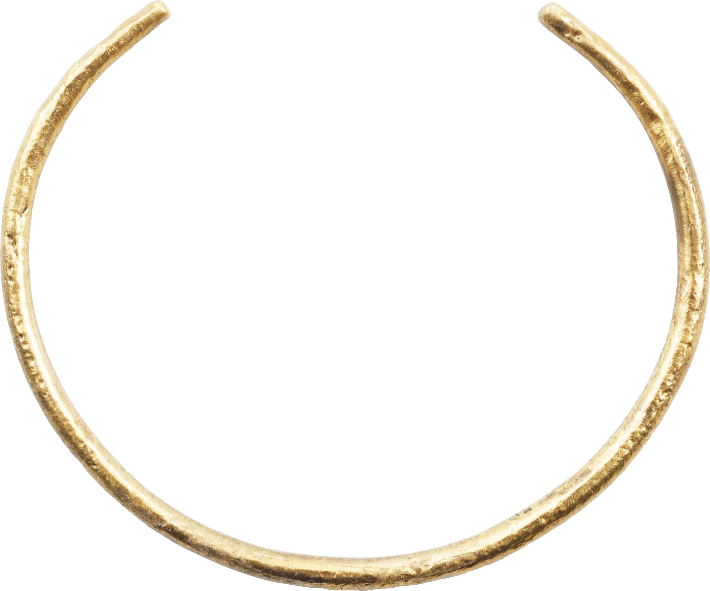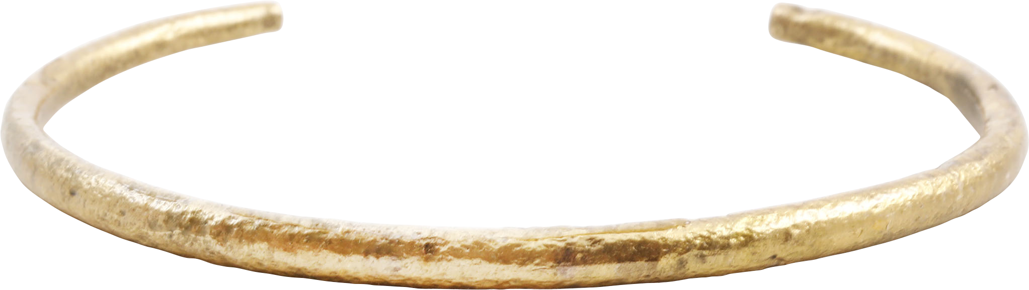 Gilt bronze. C form tapering slightly from the center to the terminals. 4.2mm thick in the middle. 2.71” inside dimension with 1.48” opening. Surface textured from burial and restored with 24karat gold. Gift boxed with certificate of authenticity.
