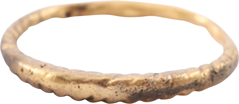 Gilt bronze. Round of round section with 2/3 its circumference roped or of spiral form. The spiral or helix held spiritual significance for Vikings. These were worn in the hair, particularly around the ears and can be worn on the finger as a size 9 ¾ ring. Professionally refurbished with the 24karat gold overlay restored. Jewelry gift boxed with certificate of authenticity.
