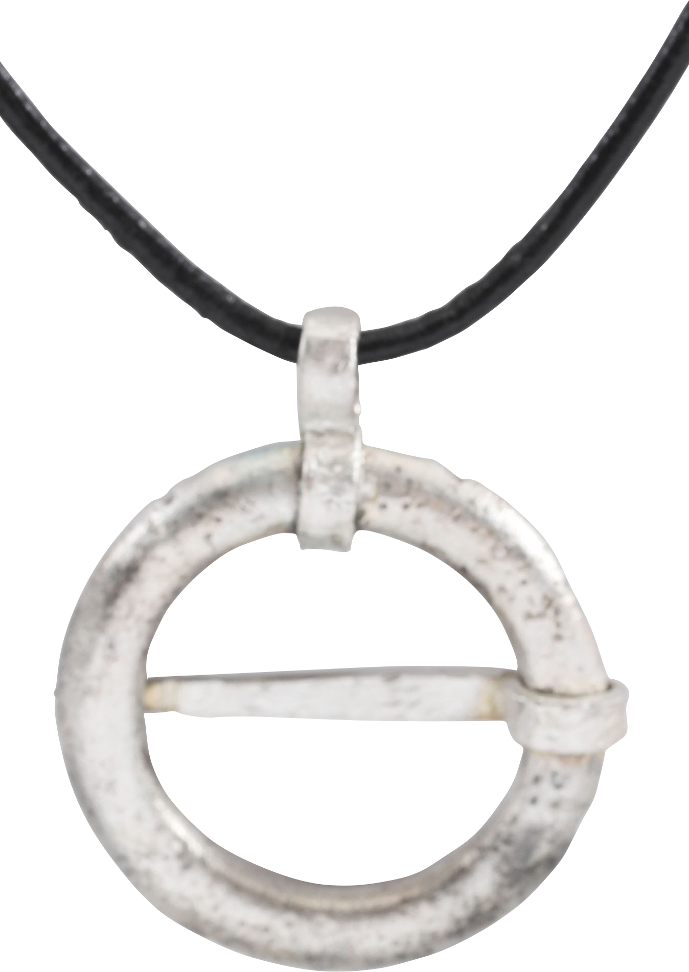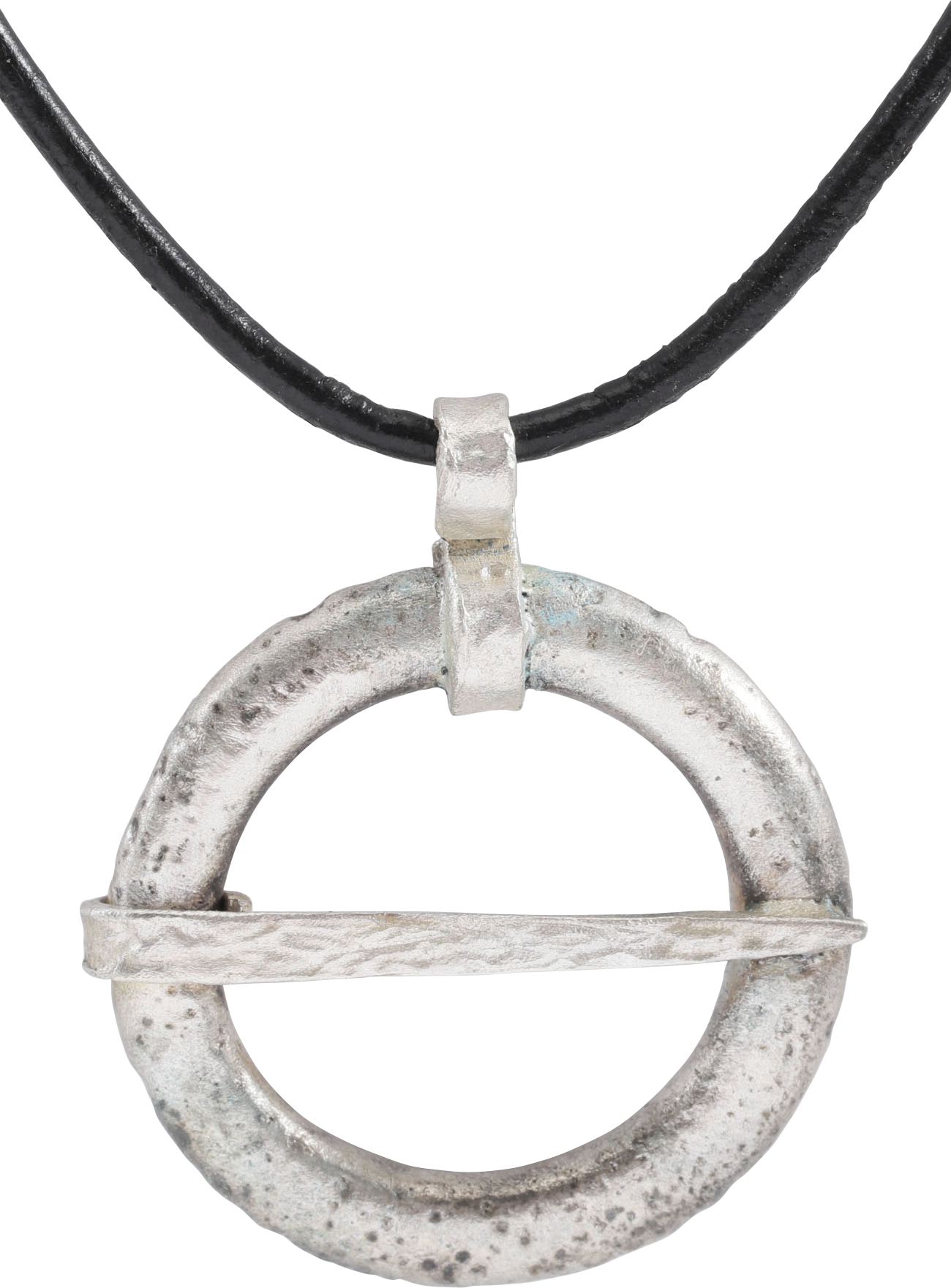 Silvered bronze, over 1 1/8” (1.18”) diameter, circular with rounded face and back forming ridged edges. Tapered cross pin.  When fastened to the jerkin, these small metal brooches provided a measure of protection against sword cuts and, in fact, were a form of armor.  In addition to being more decorative, examples of this form provided added protection with the trailing tails. See current Public Television programming for documentation of these in action. As protectors, they also held spiritual significance for the warrior. Degraded from burial and professionally refurbished with the pure silver overlay restored. Suspended from an 18” Sterling silver mounted polished leather neck cord. Gift boxed with certificate of authenticity.