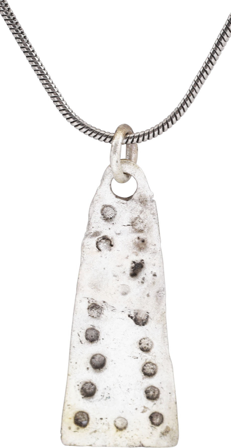 About 1 1/4 “ (1.20”) height. Silvered bronze, shaped as a   duck's foot with raised detail simulating scaly skin. A burial at Fyrkat Denmark contained the body of a woman of wealth and status buried with henbane seeds, which have hallucinogenic properties, and a wand as well as other objects. From these, it was concluded that she was a seeress or sorceress. The grave contained a necklace hung with three duck feet pendants very similar to this. Professionally refurbished with silver overlay and mounted on an 18” modern sterling silver neck chain for contemporary wear. Jewelry gift boxed with certification of authenticity.