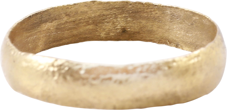 Gilt bronze, size 10 1/2. Medium width band 4.5mm, with a well rounded face. Surface textured from burial. Professionally refurbished with the 24karat gold overlay restored. Jewelry gift boxed with a Certificate of Authenticity.