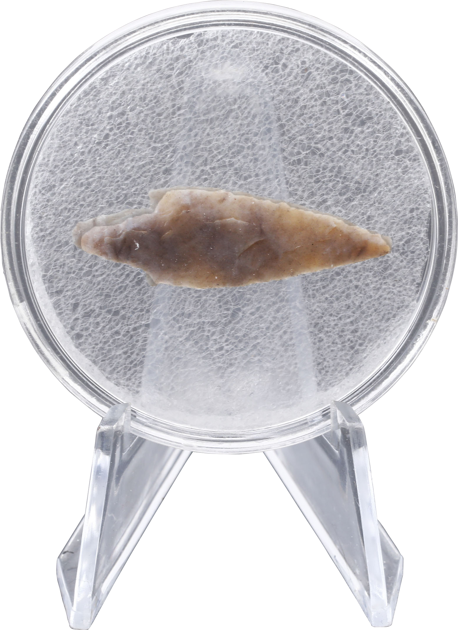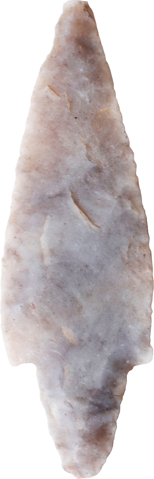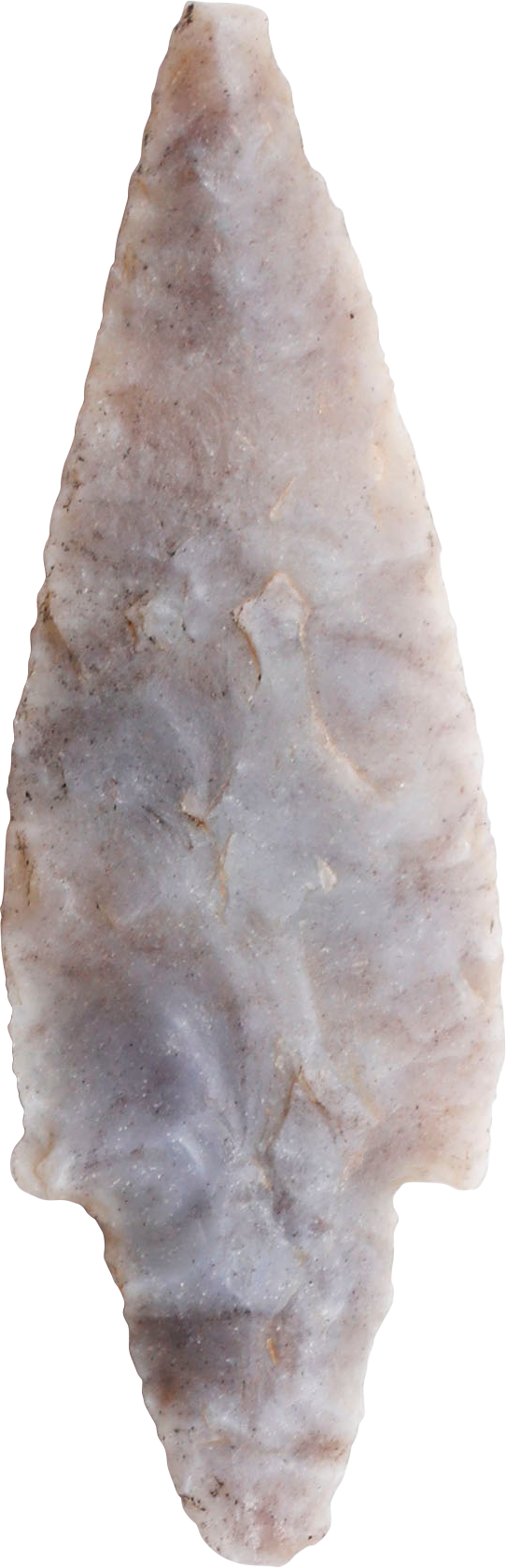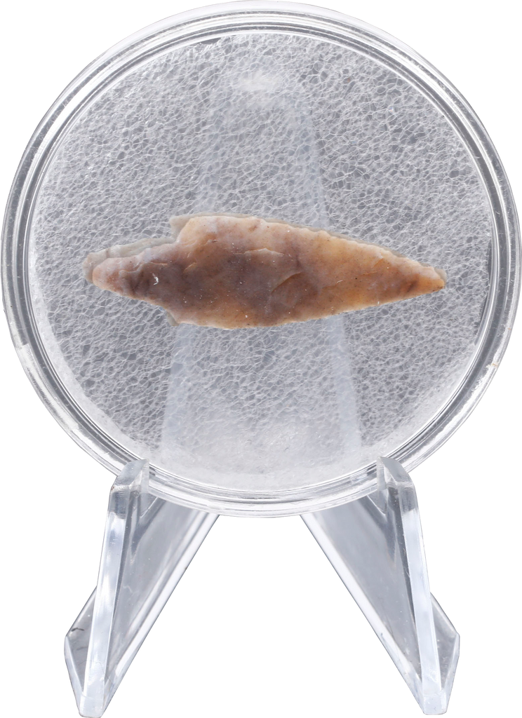 Flaked flint, with both faces shaped (bi-face) as opposed to the earlier mono-face type and thick section. Elongated triangular shape with triangular tang and delicate barbs. The stone with nice buff/gray color. About 1 1/2” (1.48”)” length. Large war or hunting example.