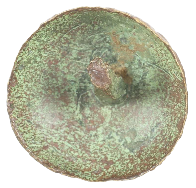 Also called bosses, but that term more correctly applies to the central mount or umbo which accommodated the fist gripping the shield. The studs were large rivets which secured the boss and laminations of the wood core. Slightly over 1” diameter, domed, hollow with integral shank.