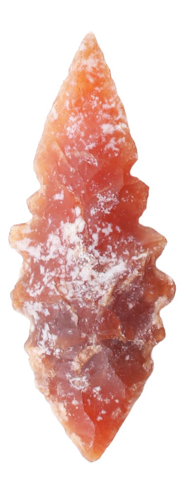 Small. Finely flaked example of red stone (chert?). Under ¾” (0.74”). Lozenge form with scalloped edge medial. Buried with the deceased for use in the afterlife.