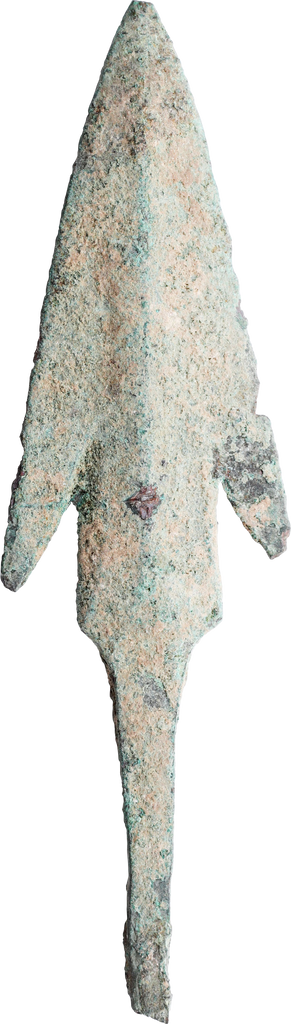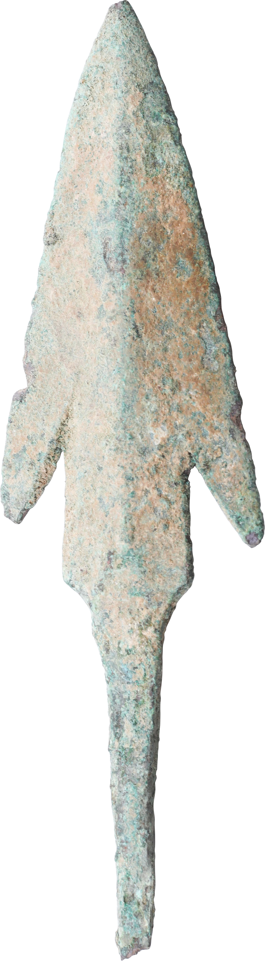 Large example, about 2 3/4" (2.72”) length, finely formed with conical median and slender barbed fins. Tapered tang. See European Arrowheads and Crossbow Bolts, Rau, p.25 for another example, where the author identifies this form as an improvement of about 900 BC over the earlier leaf and triangular shaped examples. Crisp with superb glossy patina. A thick point suitable for battle.