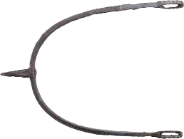 Iron, 4 1/2" length, of delicate form, having evolved from the Roman form which a small spike plate secured with a leather harness. Straight rounded face sides with needle eye terminals decorated on the outside with a series of nubs. The small elongated conical prick made separately with a stem through the frame and peened on the back. Excavated with about half original surface to the frame, and surface rust growth to the balance. We've found no pictured actual examples in literature. See Der Sporn pl.III 7b for a line illustrated example.