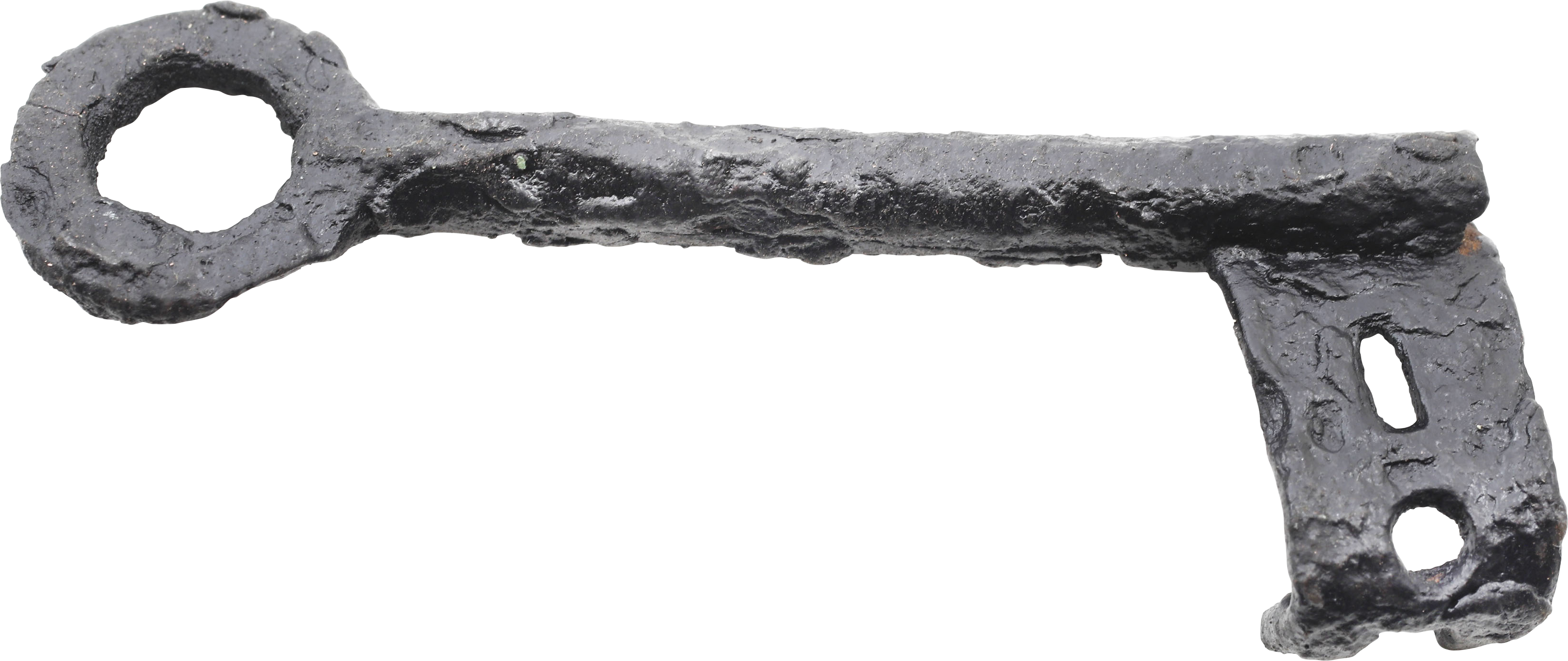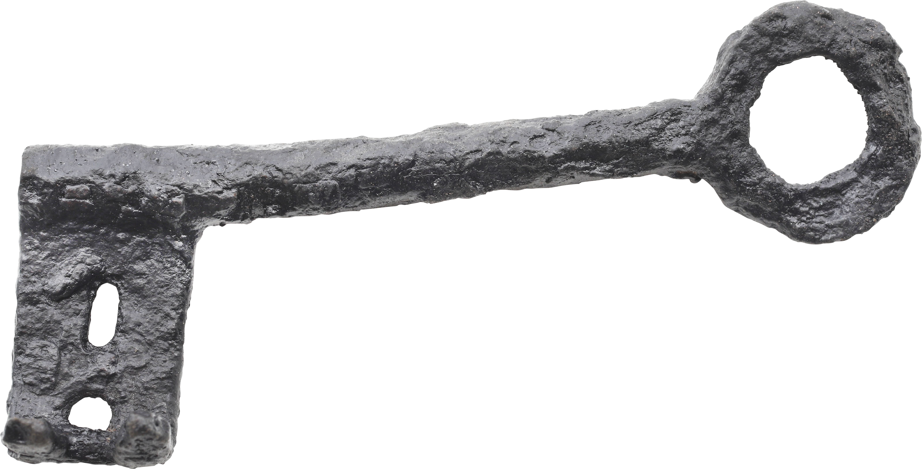4 1/8” length, forged iron with tubular shank, ring terminal and large right angled bit with bifurcated end and double pierced holes. These later would have operated against pronged obstacles which would have prevented a conventional key to rotate.