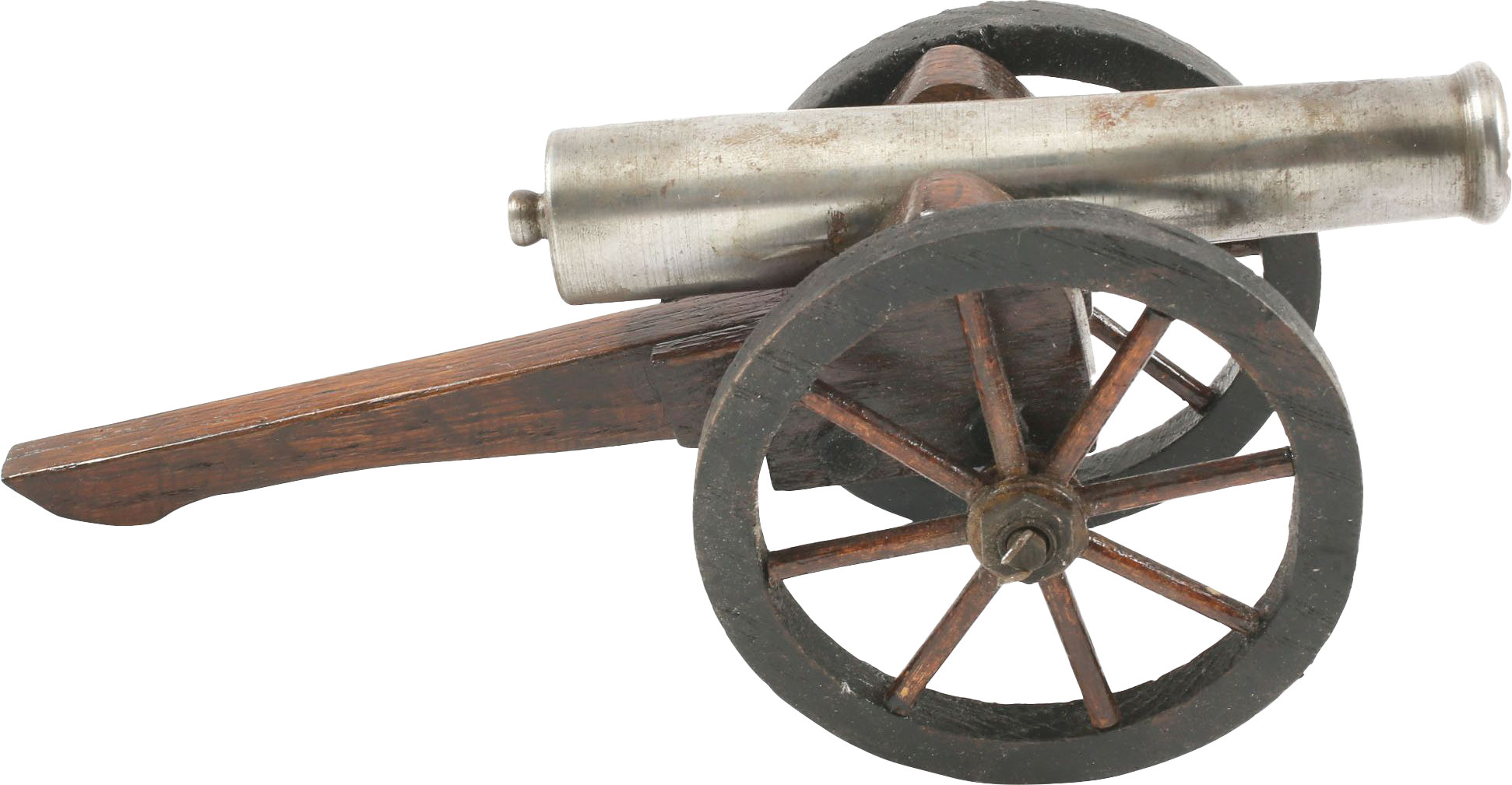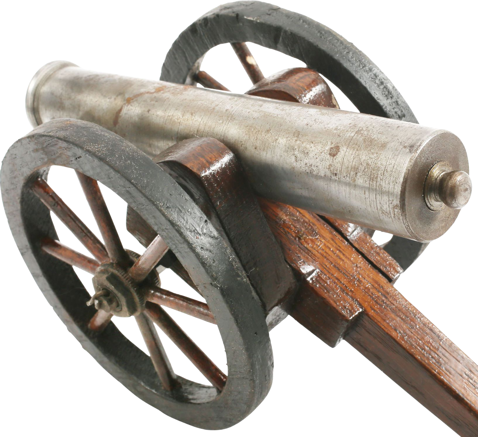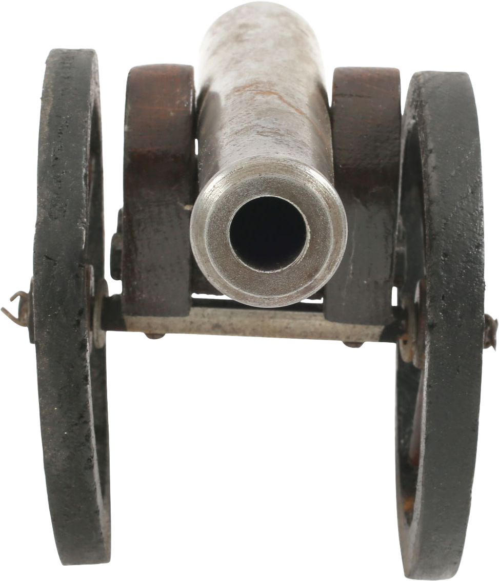 Early 20th century. 6” machine shop made barrel, tapered through its length with a ringed muzzle and cascabel. Varnished wood carriage and wood wheel, each of 11 separate pieces. Shows its age with minor finger staining to the barrel. 9 3/8” total length. Charming.