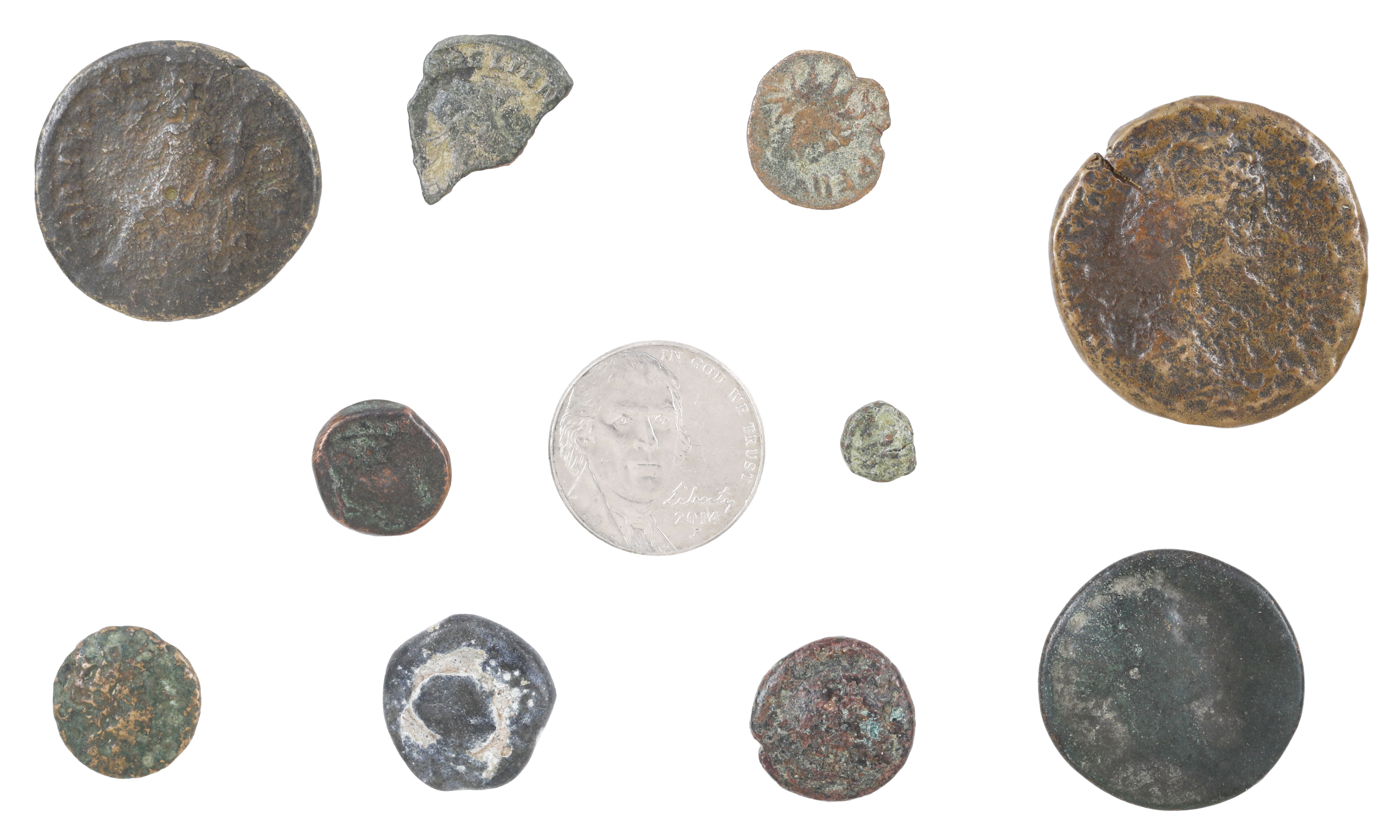 First to Tenth century AD. Ten coins. Worn, but great to stimulate young minds. Collection of the ten pieces shown, in a drawstring gift bag. Shown with a modern US nickel for scale.