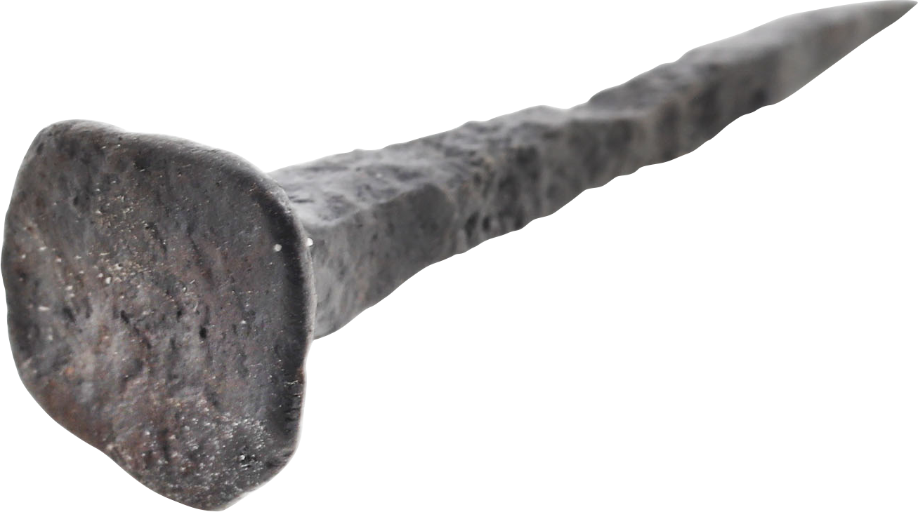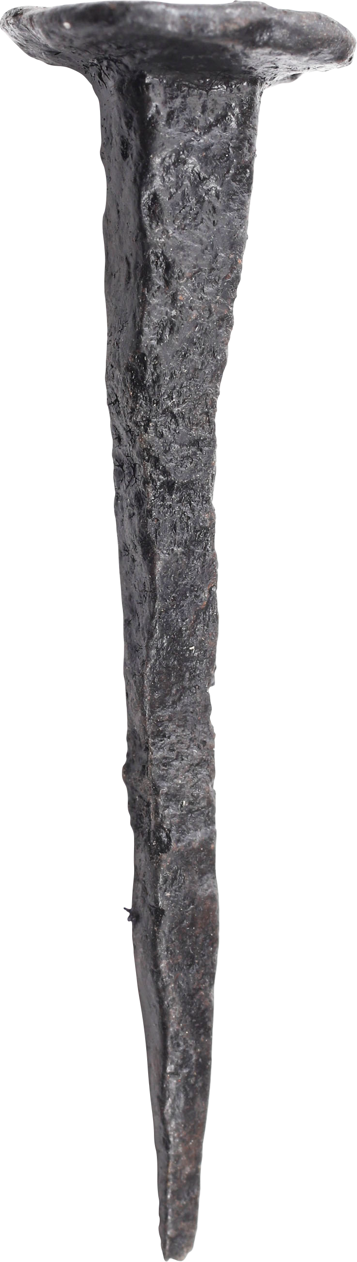 Forged iron, just under 2 3/4” (2.73”) length with an overbroad square head and long thin spike. Archeological evidence indicates that common nails were used for crucifixions. However, virtually all of those are nails embedded in ankle bones. As the nails for securing hands were in soft tissue, no such combinations survived. For the same reason, the heads of those nails must have been expanded to secure the hands as standard nails would have simply pulled out under the weight of the body. These large head nails are believed to be for crucifixions and no other function is known or suggested for them. Crucifixions were very common throughout the entire Roman Empire. From a small group acquired last year.