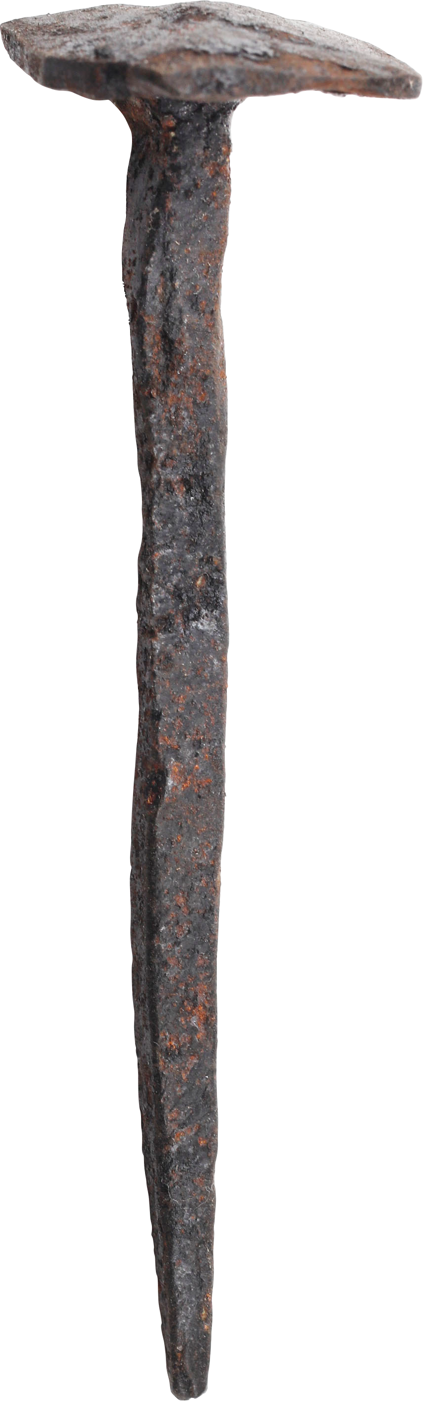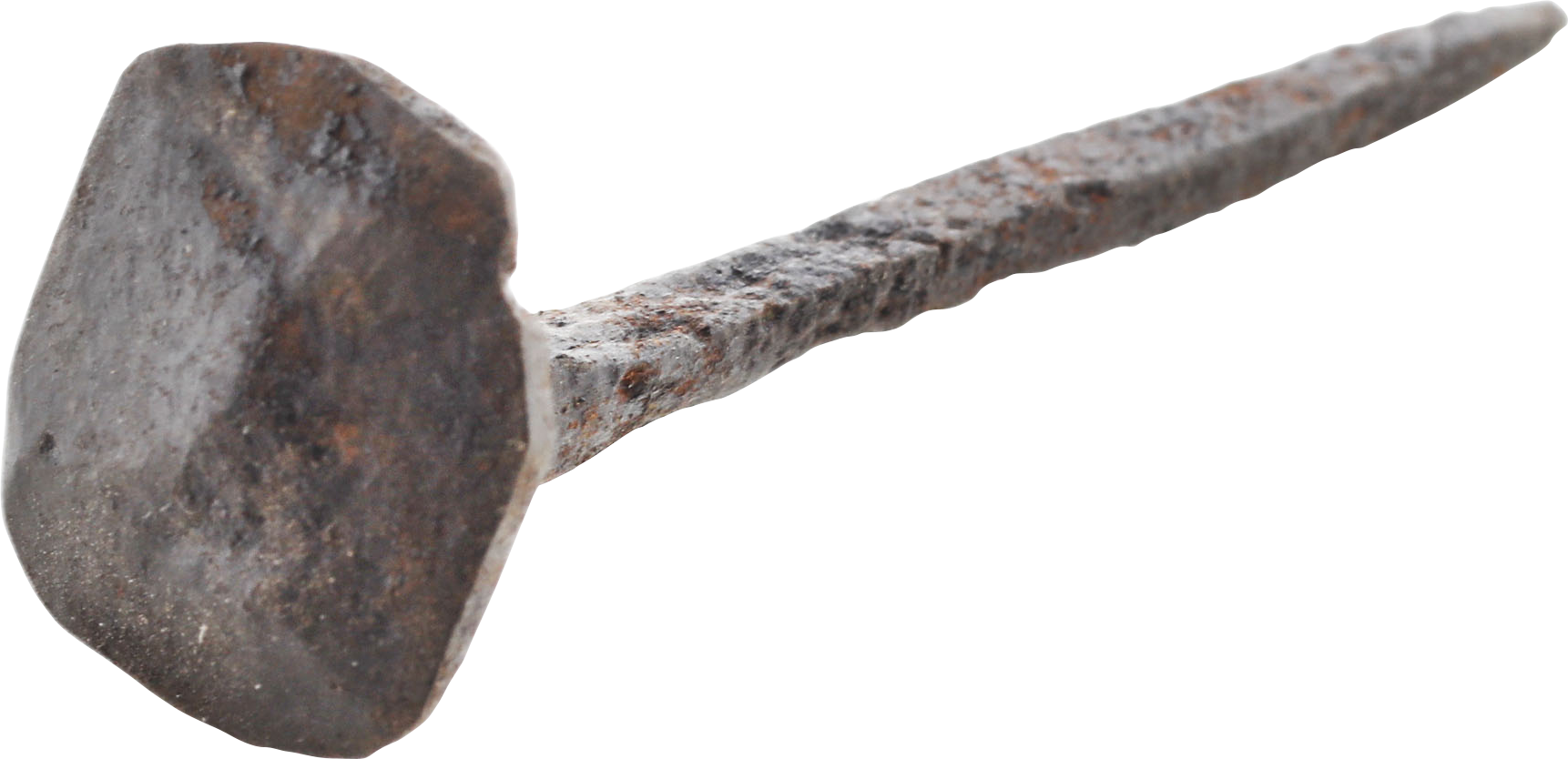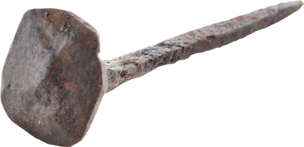 Forged iron, just under 3 1/4” (3.13”) length with an overbroad square head and long thin spike. Archeological evidence indicates that common nails were used for crucifixions. However, virtually all of those are nails embedded in ankle bones. As the nails for securing hands were in soft tissue, no such combinations survived. For the same reason, the heads of those nails must have been expanded to secure the hands as standard nails would have simply pulled out under the weight of the body. These large head nails are believed to be for crucifixions and no other function is known or suggested for them. Crucifixions were very common throughout the entire Roman Empire. From a small group acquired last year.
