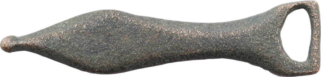 Bronze, tear drop form, just over 1 1/2” (1.56”) length. Elegantly made with elongated leaf shaped body with small nub finial. Used after the mid second century through the third century, when sword belts had double ends. See Forum Ancient Coins, 40th image for identical examples and a very specific scholarly discussion of these. Excellent. Could be worn on a necklace.