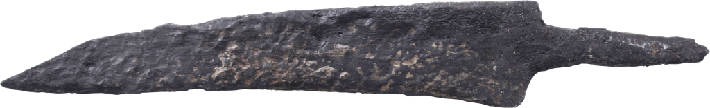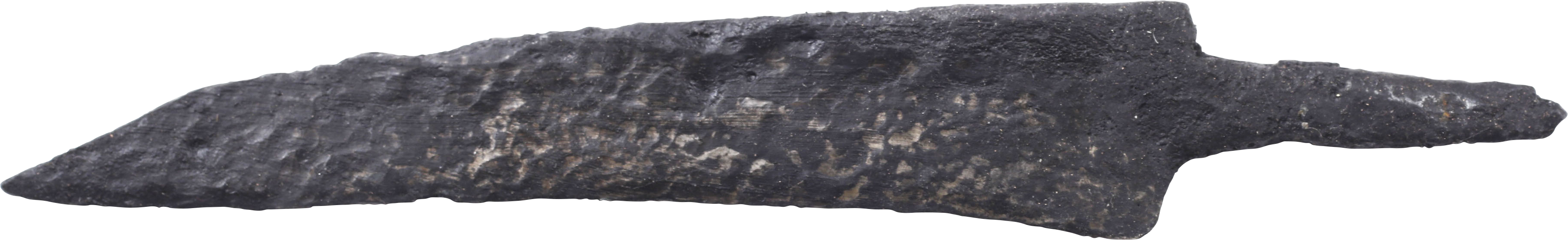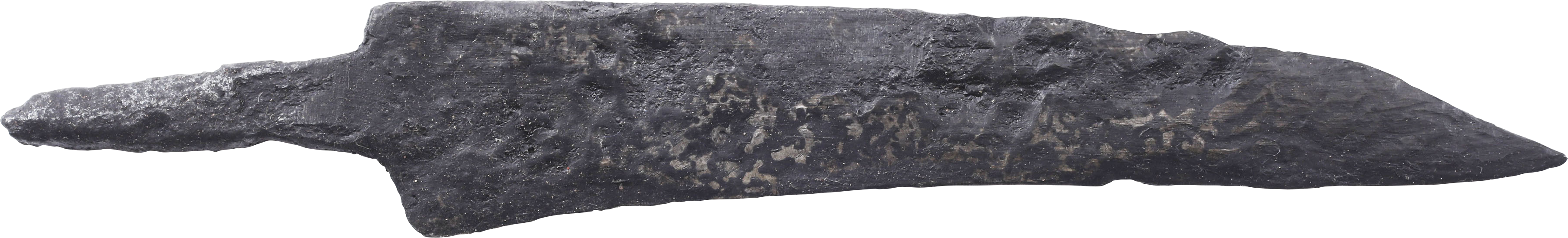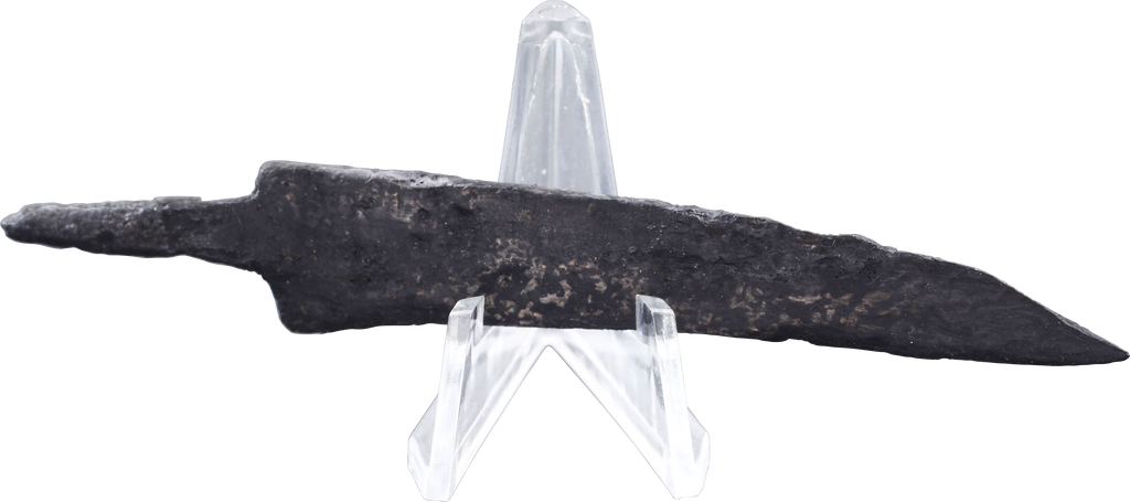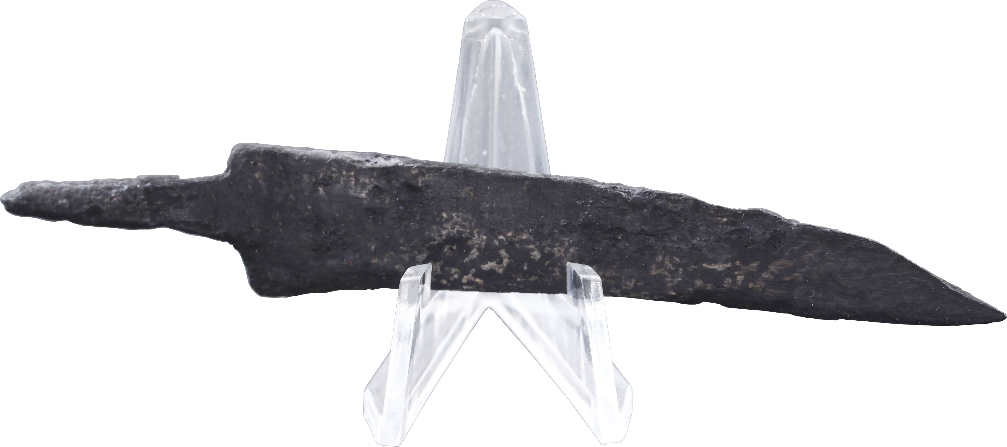 Small size, 3 7/8” (3.87”) total length. Thin slashing blade with distinct angled point in the true scramsax tradition. Originally mounted with a bone or antler grip and carried in the side pouch. A weapon made for fighting and not a working knife which would have had a thicker blade and shown evidence of repeated sharpening. Professionally refurbished with Plexiglas display mount and certificate of authenticity.