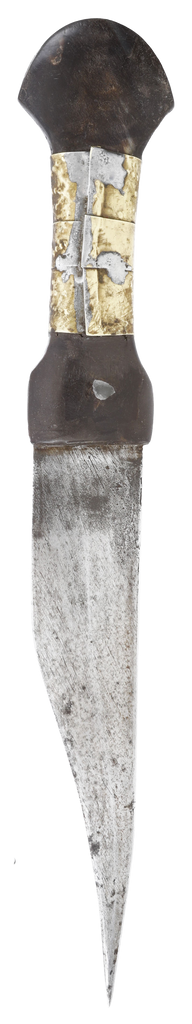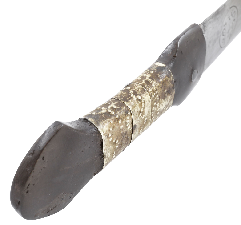 Black horn hilt (small imperfections) with embossed brass grip. 6 ½” slightly recurved blade with light tool finish and engraved Arabic calligraphy seal.
