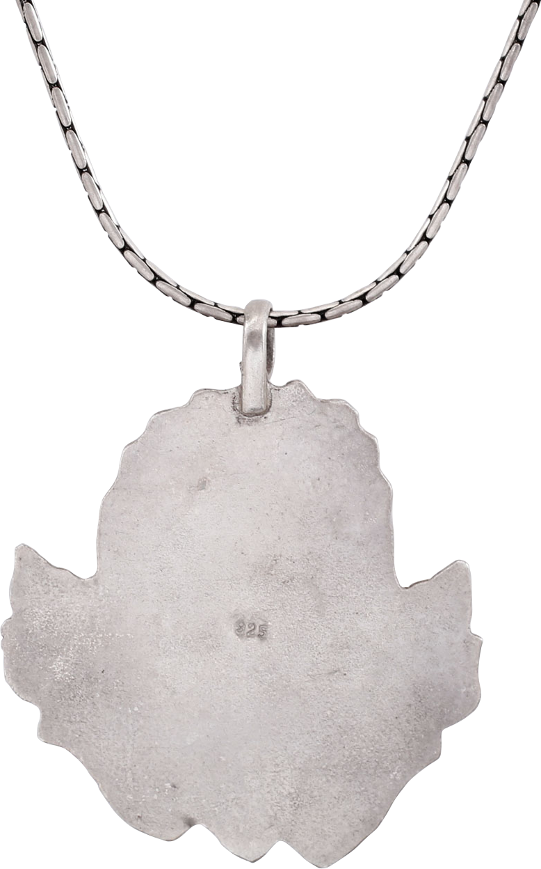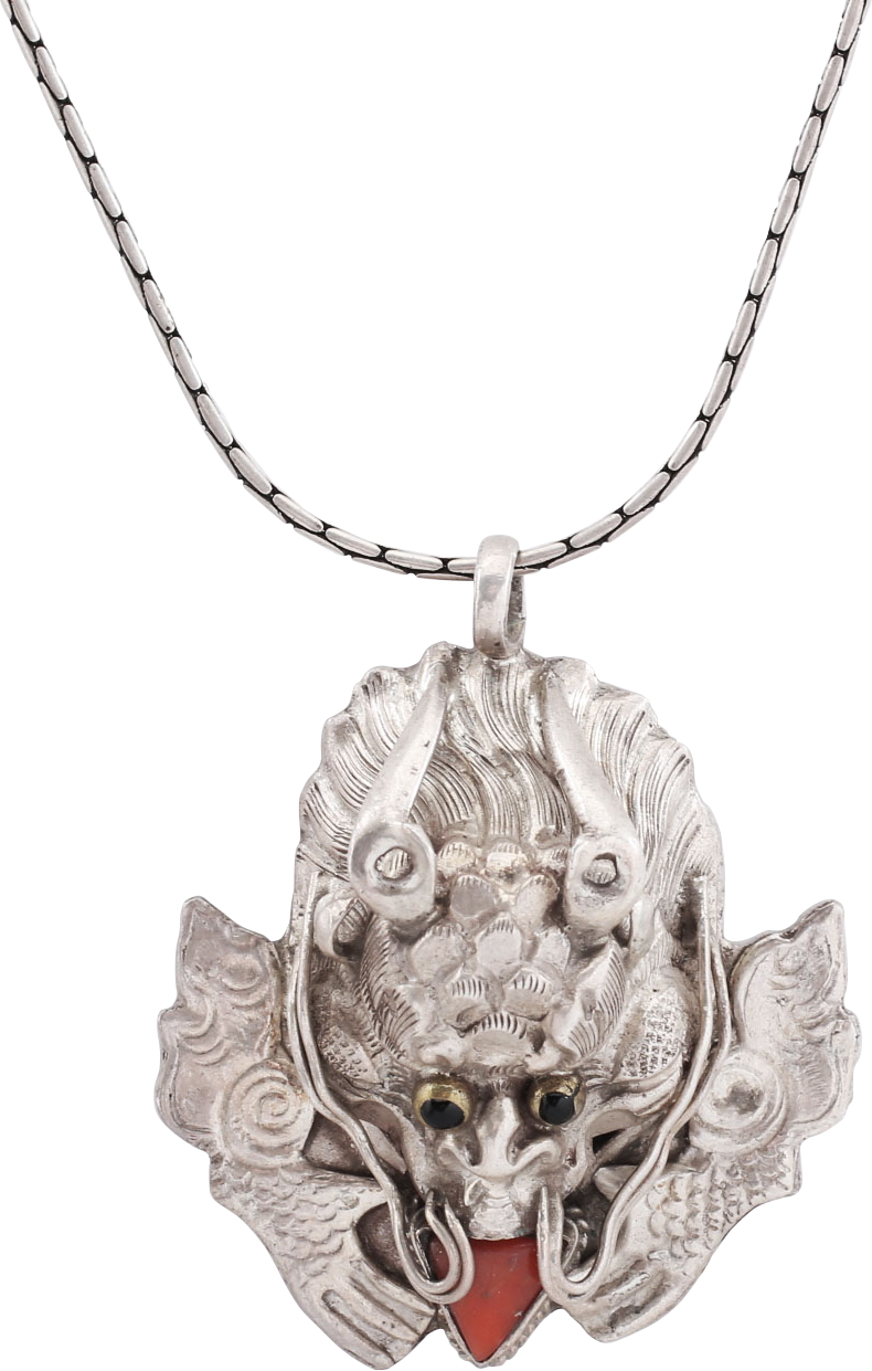Also known as Yamantaka, a wrathful manifestation of the bodhisattva Mañjuśrī in Vajrayana (Tibetan) Buddhism. Just over 1 ¾” (1.76”) height, silver (marked .825) in full relief. The head modeled with horns and slowing whiskers. Black stone (jet?) eyes and red coral tongue protruding. Beautifully detailed, on original 16” tubular silver neck chain. Probably dating to the 1950’s exodus from Tibet of Buddhism driven out by communist Chinese.
