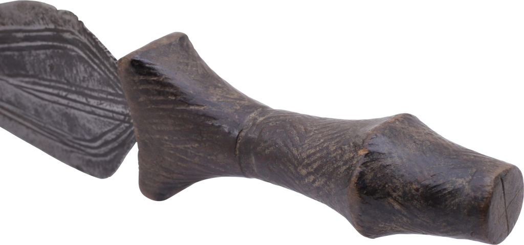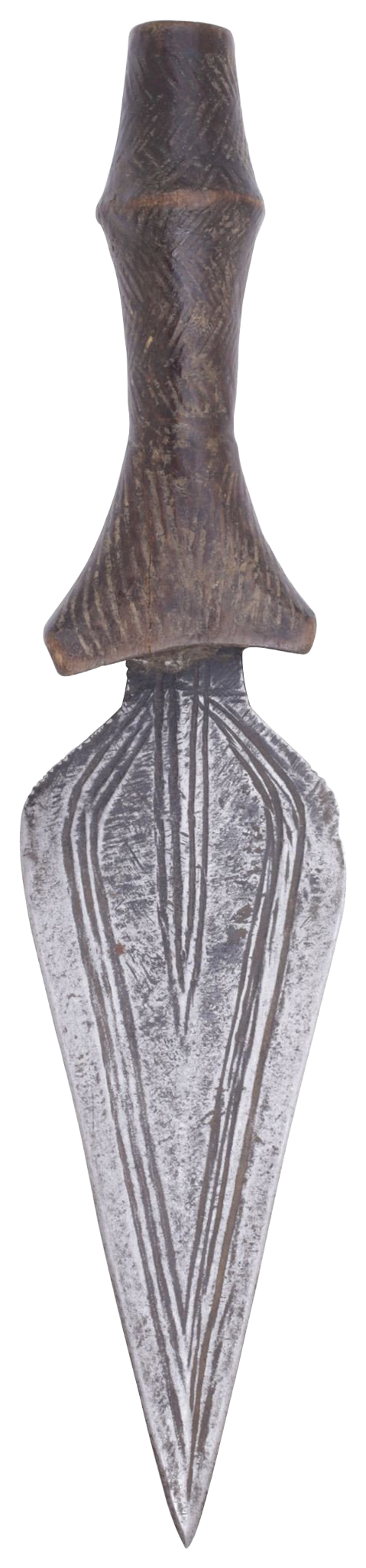 Second half of the 19th century. 7 1/4" blade boldly incised with triple lines bordering the edge and triple line medial developing to a ridge. Large shaped wood grip with flared base and expanded pommel, decorated overall with hatched and basket weave motifs. Dark glossy patina over age encrustation. Blade with dark patina and surface texture.