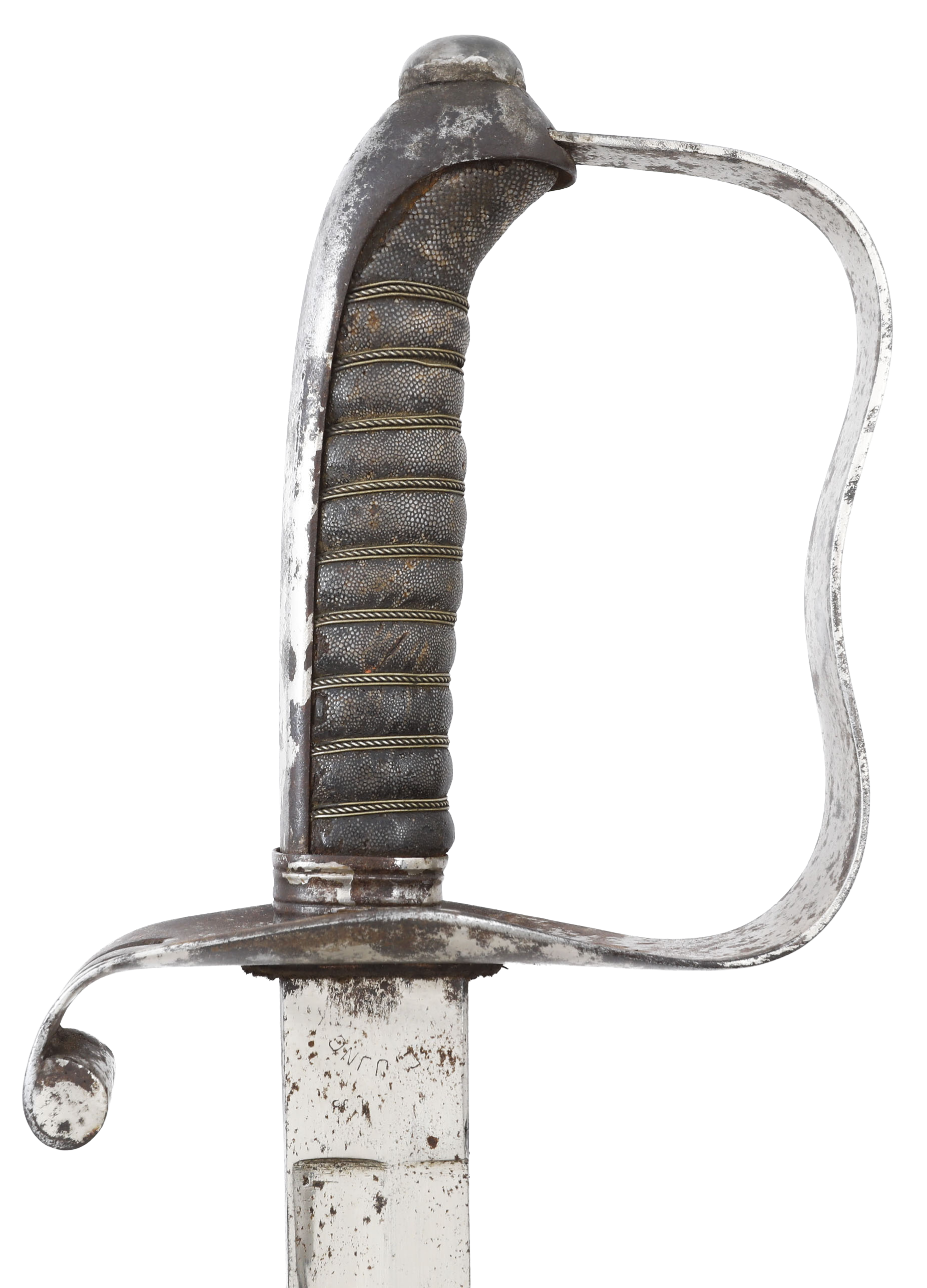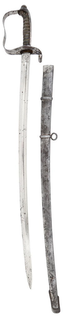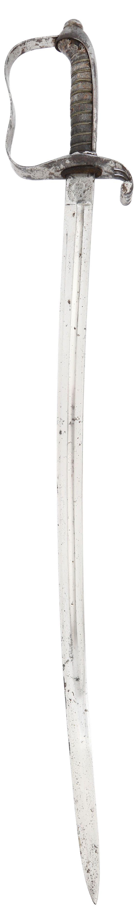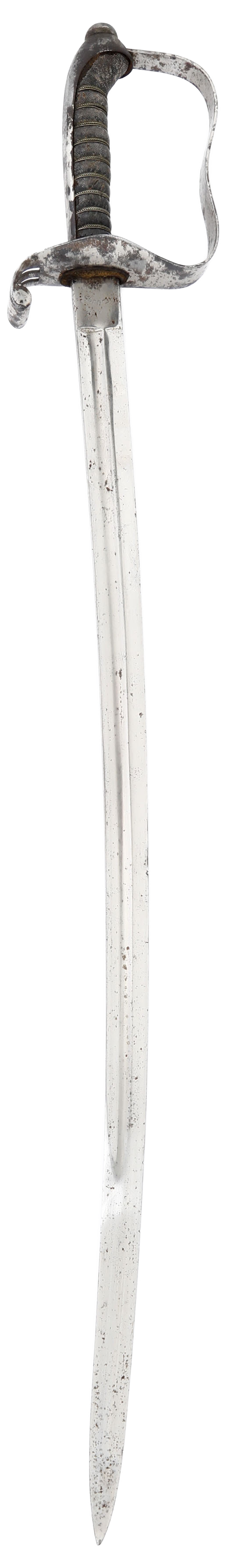 Iron hilt with double slotted guard. Brass wire wrapped ray skin grip (small loss at the heel). 29 3/4” slightly curved broad fullered blade with dedication at the forte: Ehre (honor) W T Flicht 1878-1898, commemorating his service upon retirement. Reverse with E JUNG, Vienna sword maker. Hilt shows most original plating with uniform smooth brown patina to the balance. Iron scabbard complete, with remnants of plating.